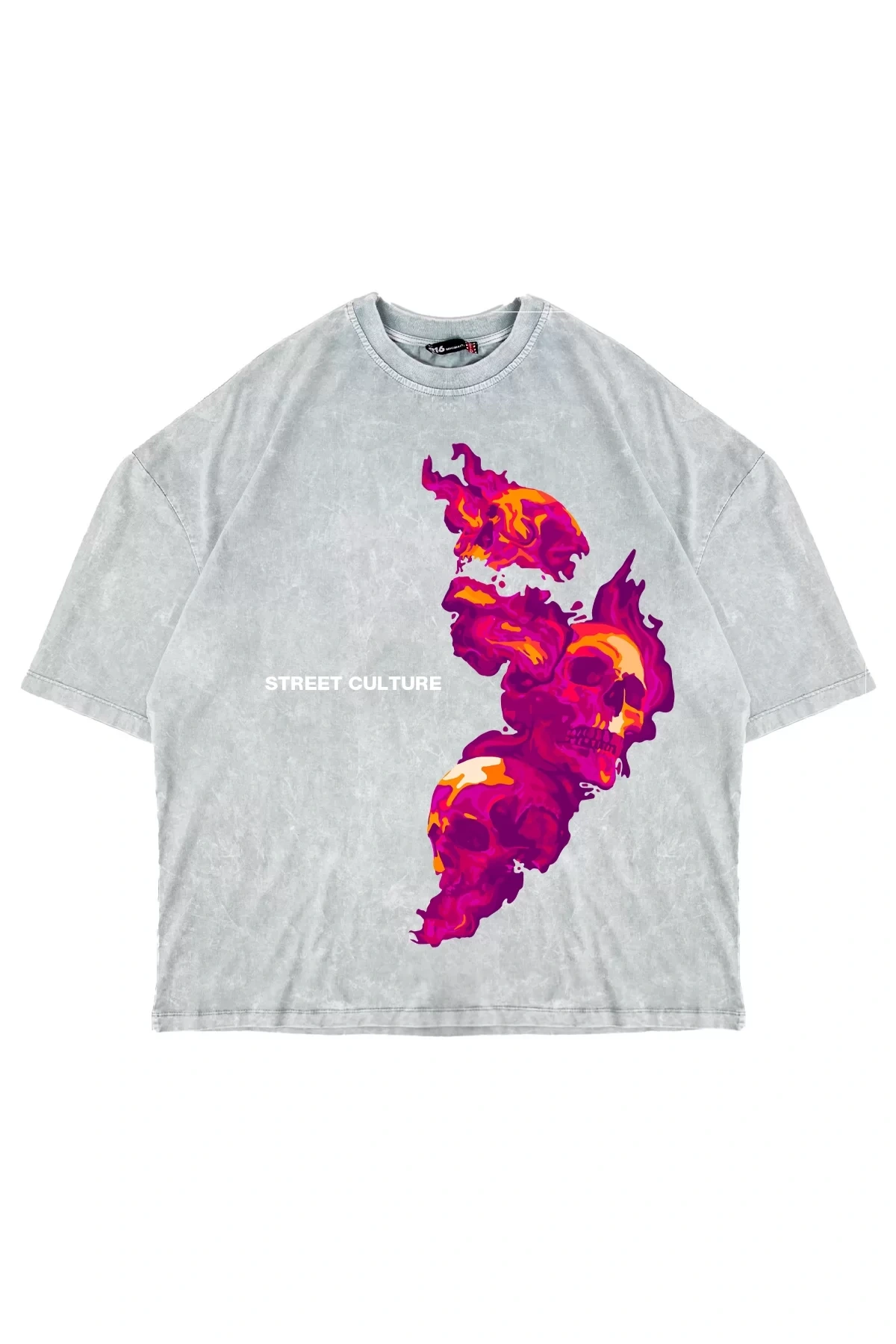 Skull Smoke 816 Baskılı 24/1 Oversize Unisex Yıkamalı Beyaz Tshirt