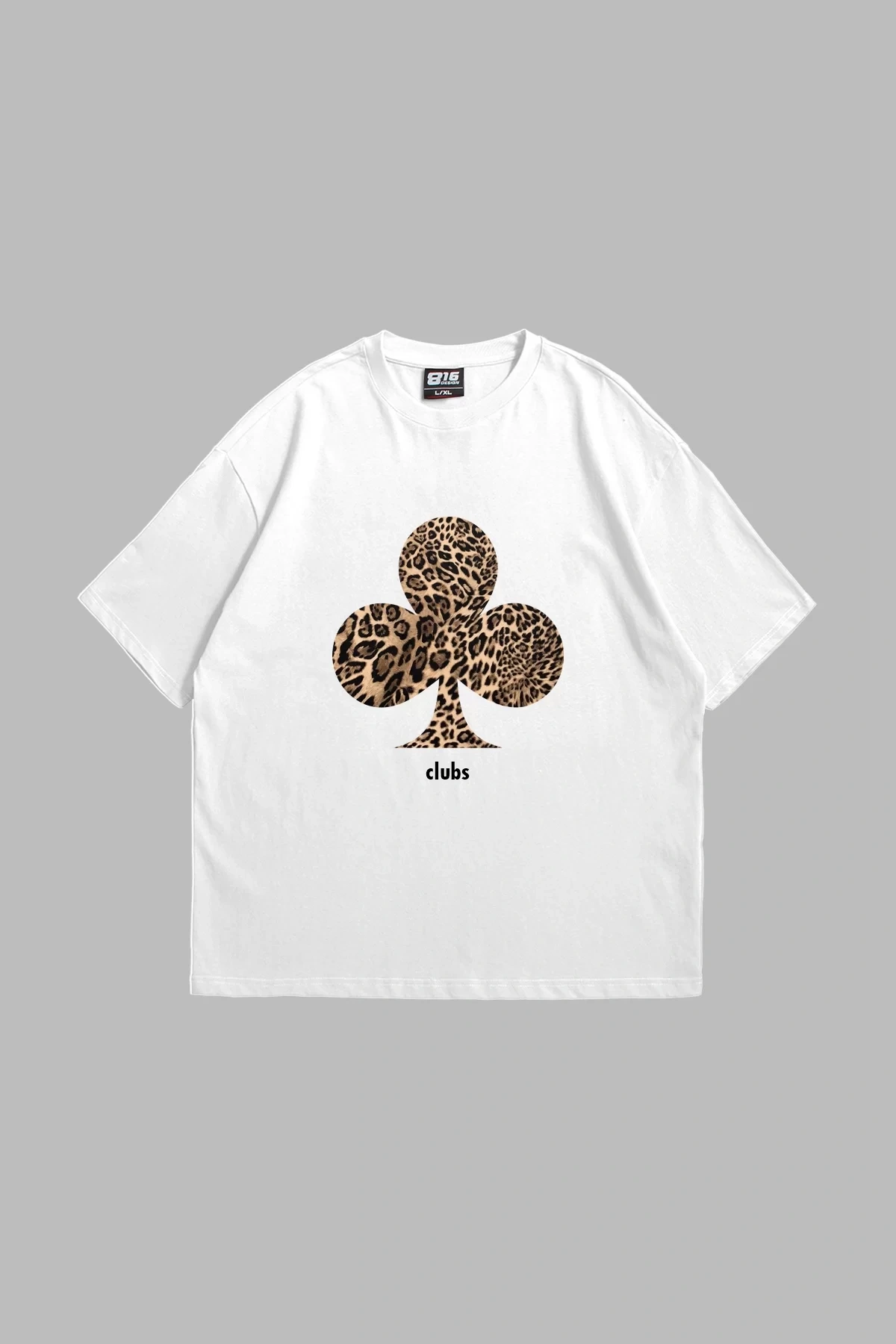Clubs Leopar Baskılı Oversize Unisex Premium Beyaz Tshirt
