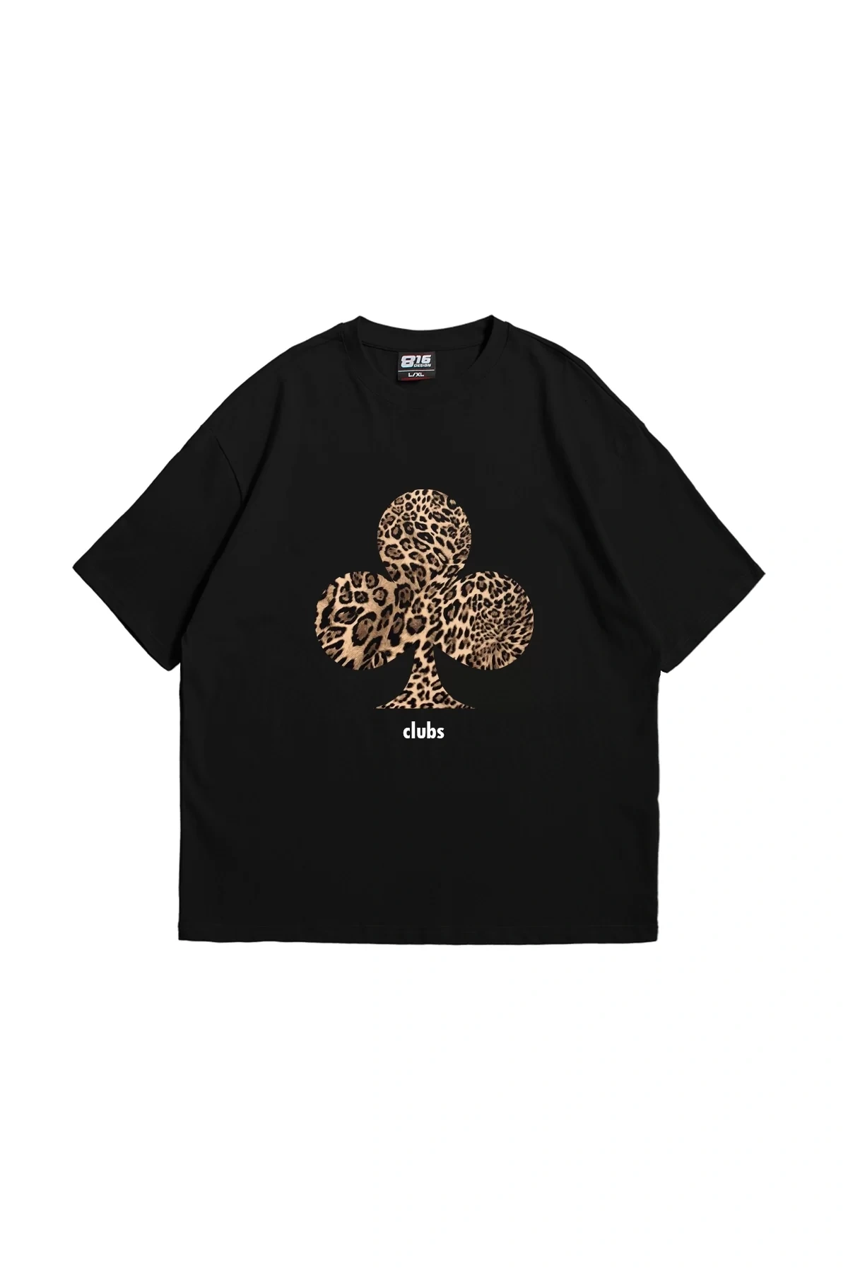 Clubs Leopar Baskılı Oversize Unisex Premium Siyah Tshirt