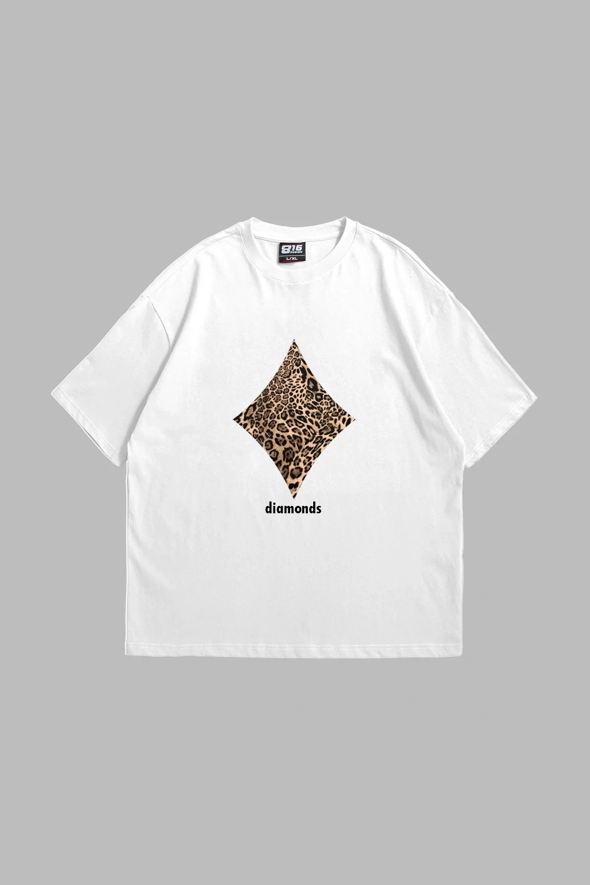 Diamonds Leopar Baskılı Oversize Unisex Premium Beyaz Tshirt