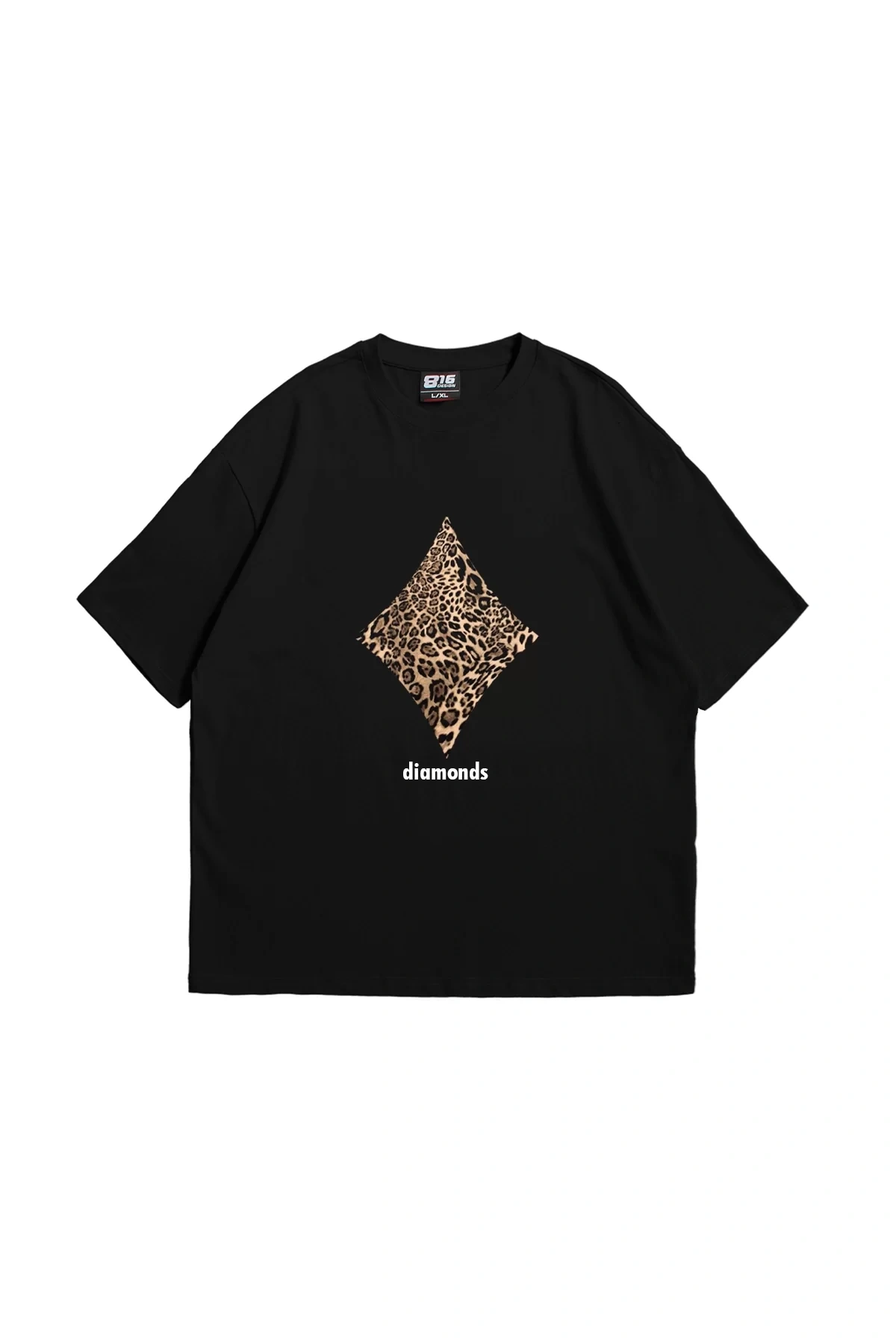 Diamonds Leopar Baskılı Oversize Unisex Premium Siyah Tshirt