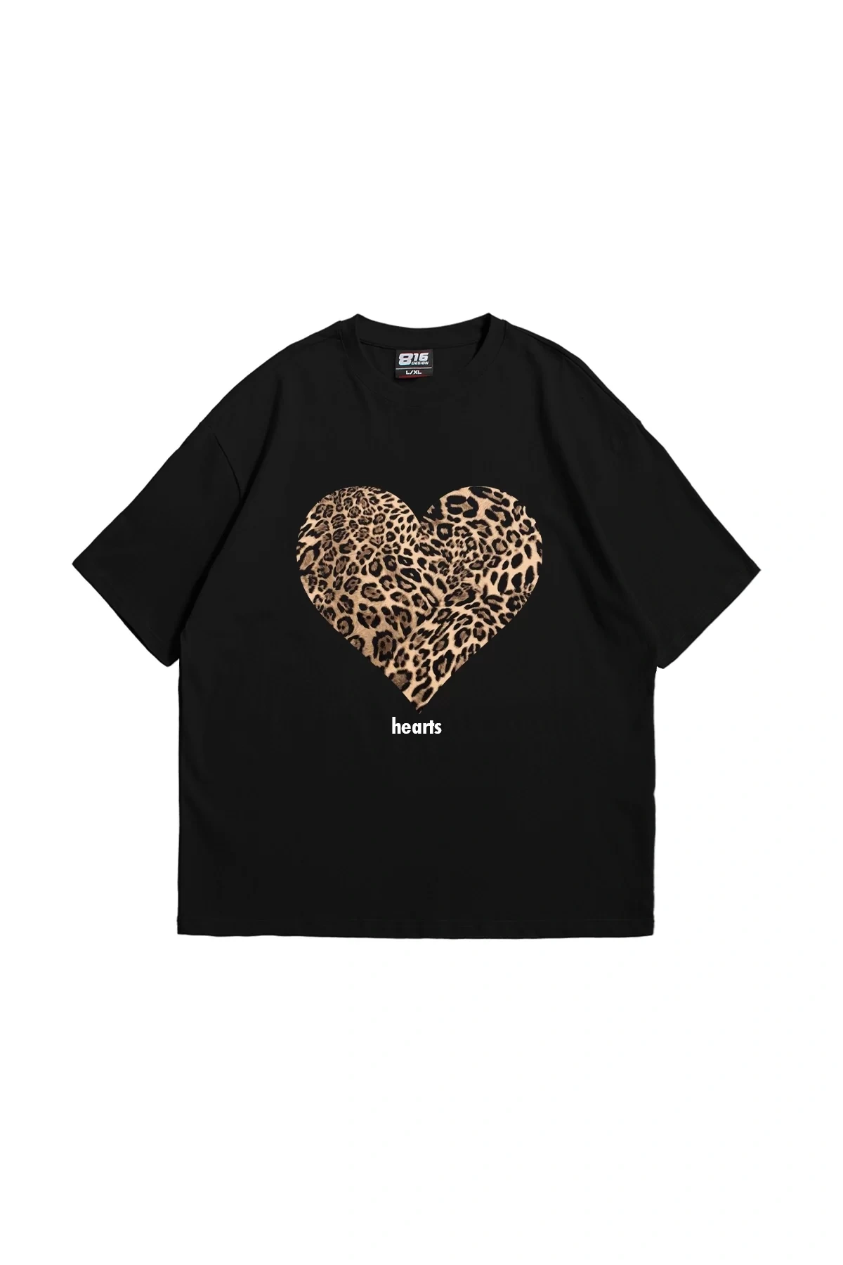 Hearts Leopar Baskılı Oversize Unisex Premium Siyah Tshirt
