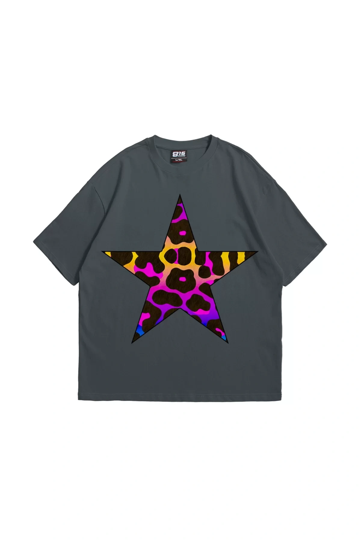 Rainbow Leopard Baskılı Oversize Unisex Antrasit Tshirt