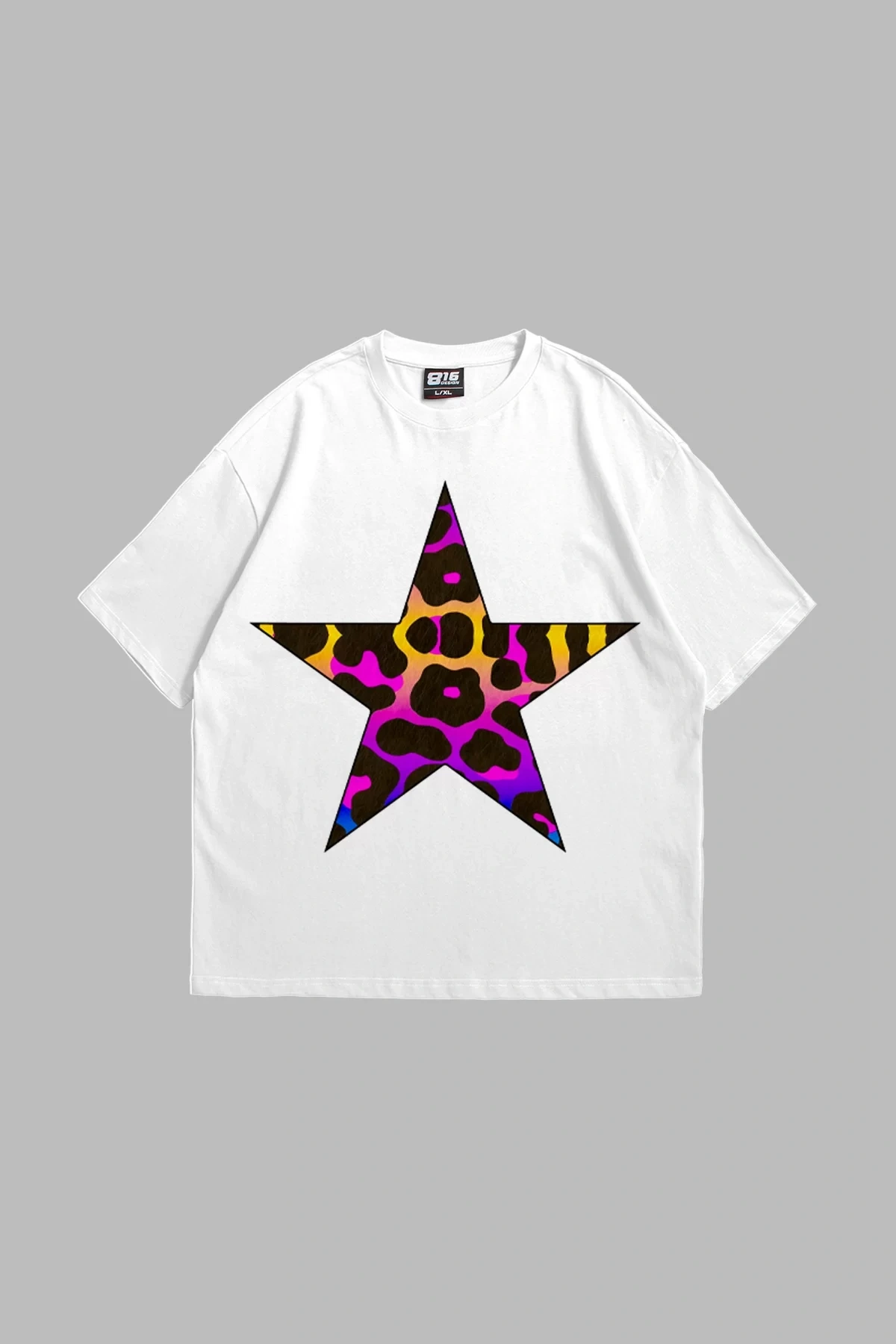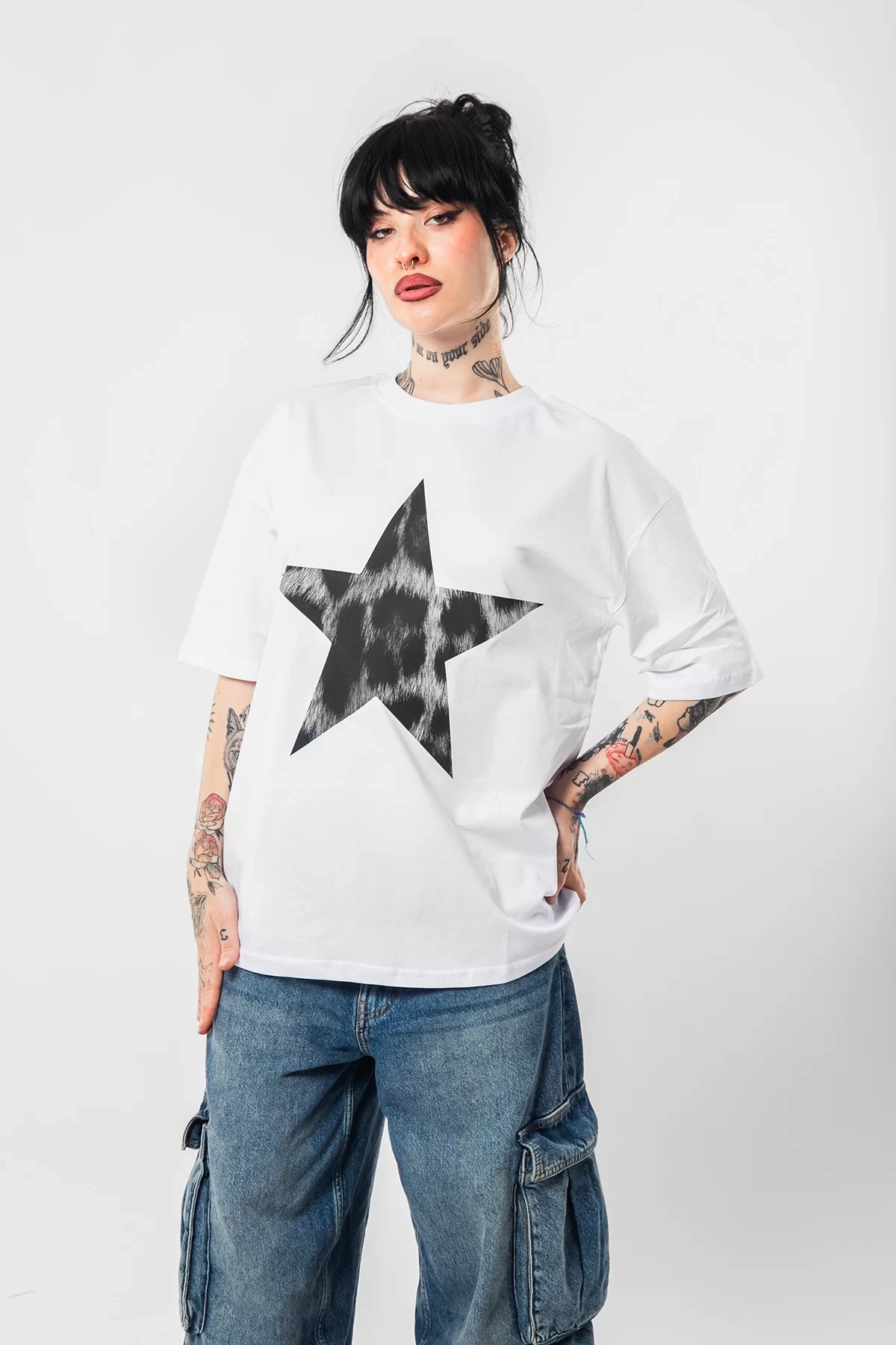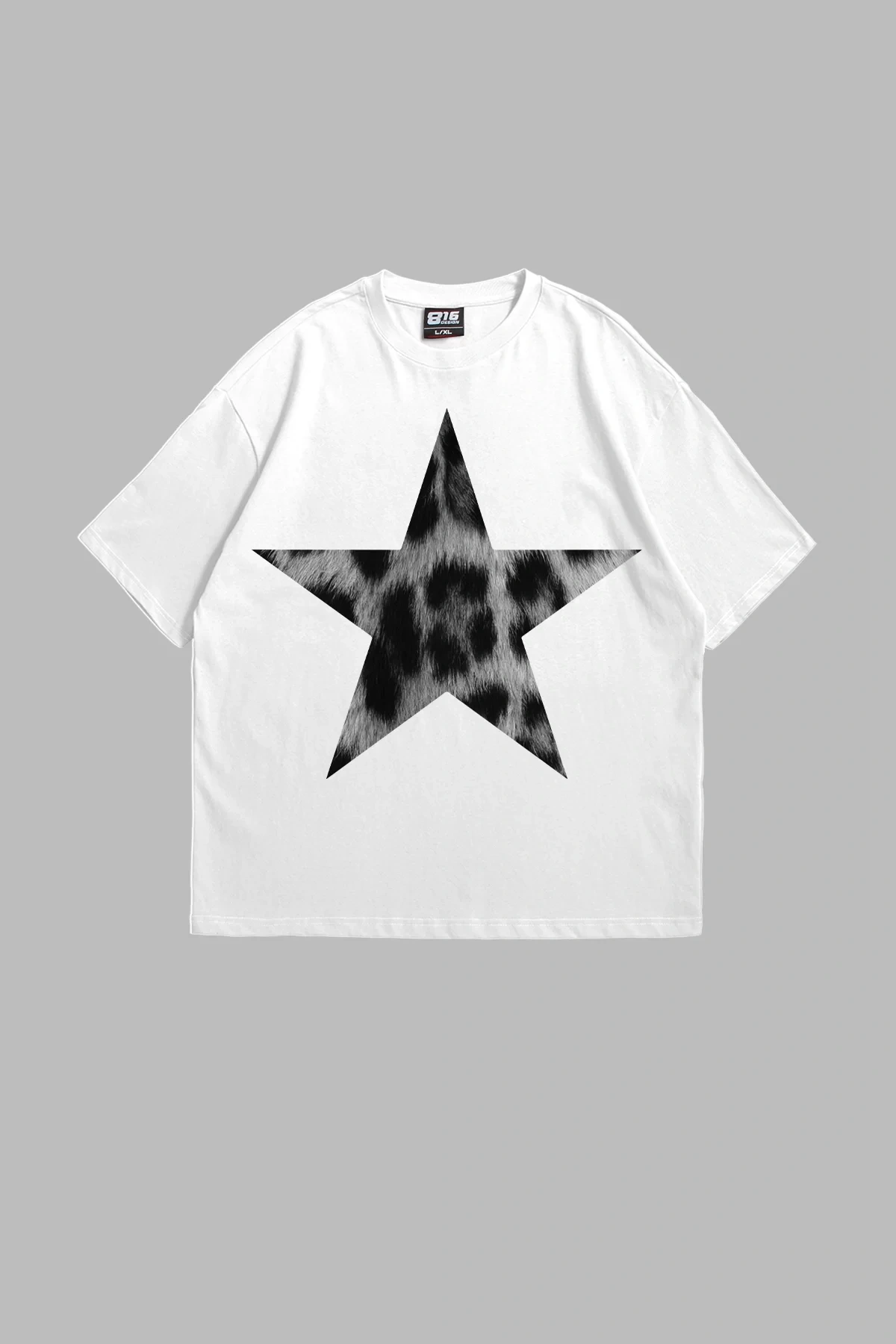 Starz Leopar Baskılı "V2" 24/1 Oversize Unisex Beyaz Tshirt