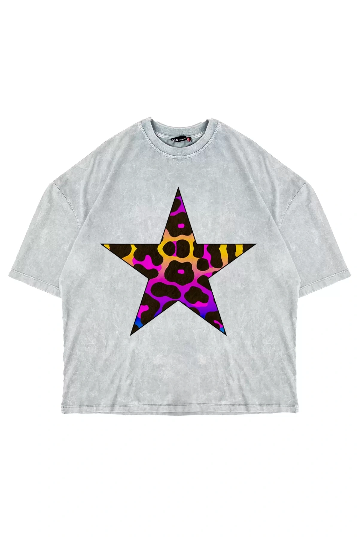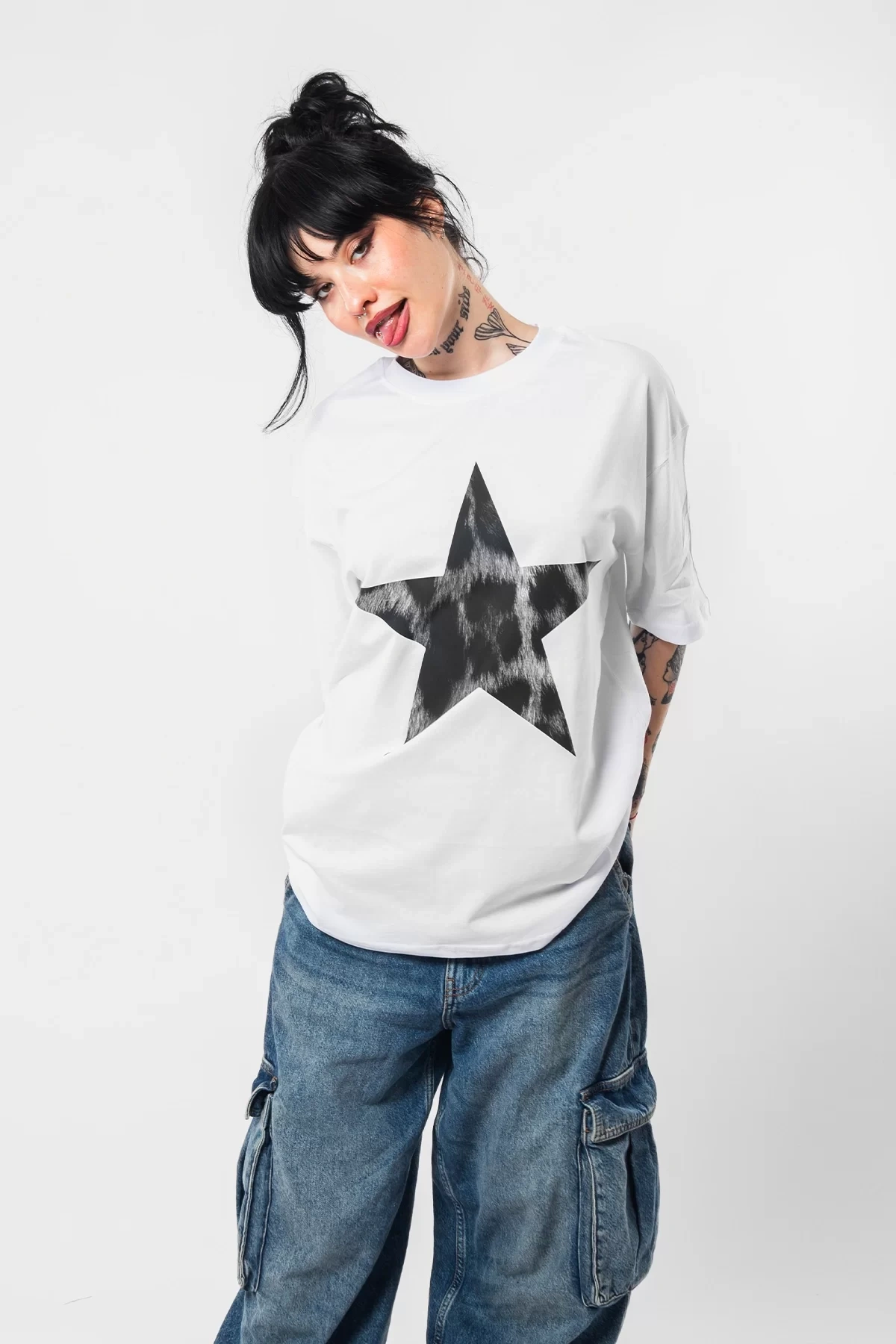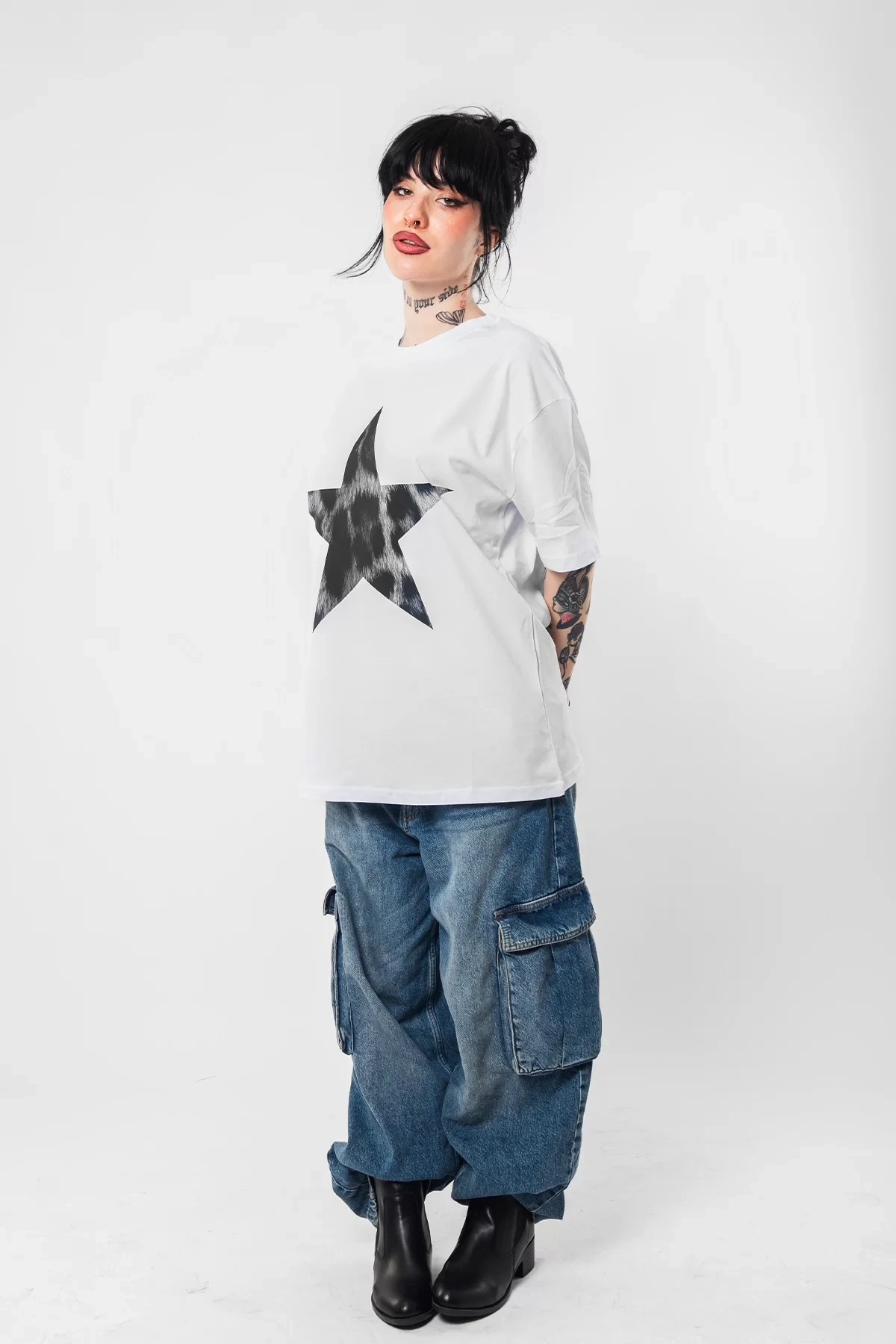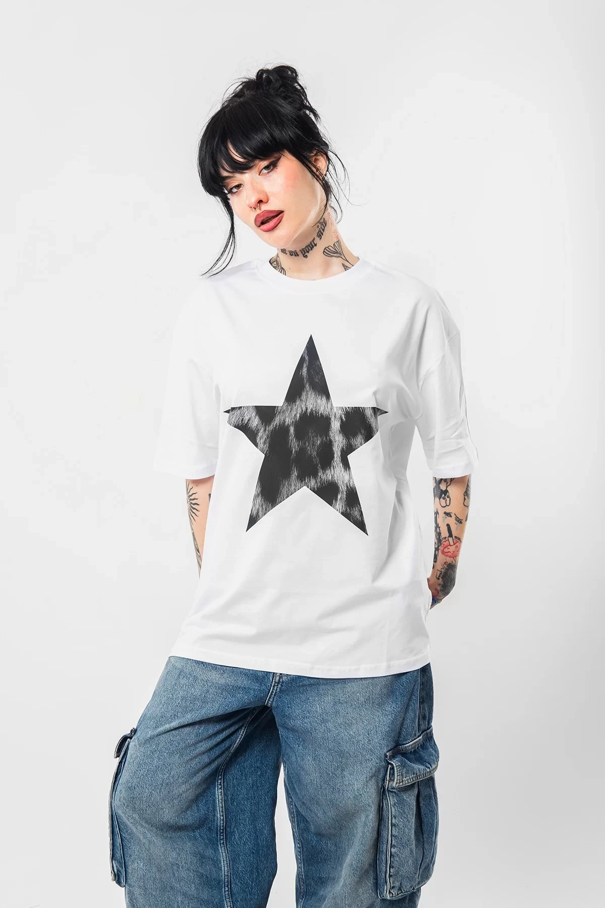 Starz Leopar Baskılı "V2" 24/1 Oversize Unisex Beyaz Tshirt