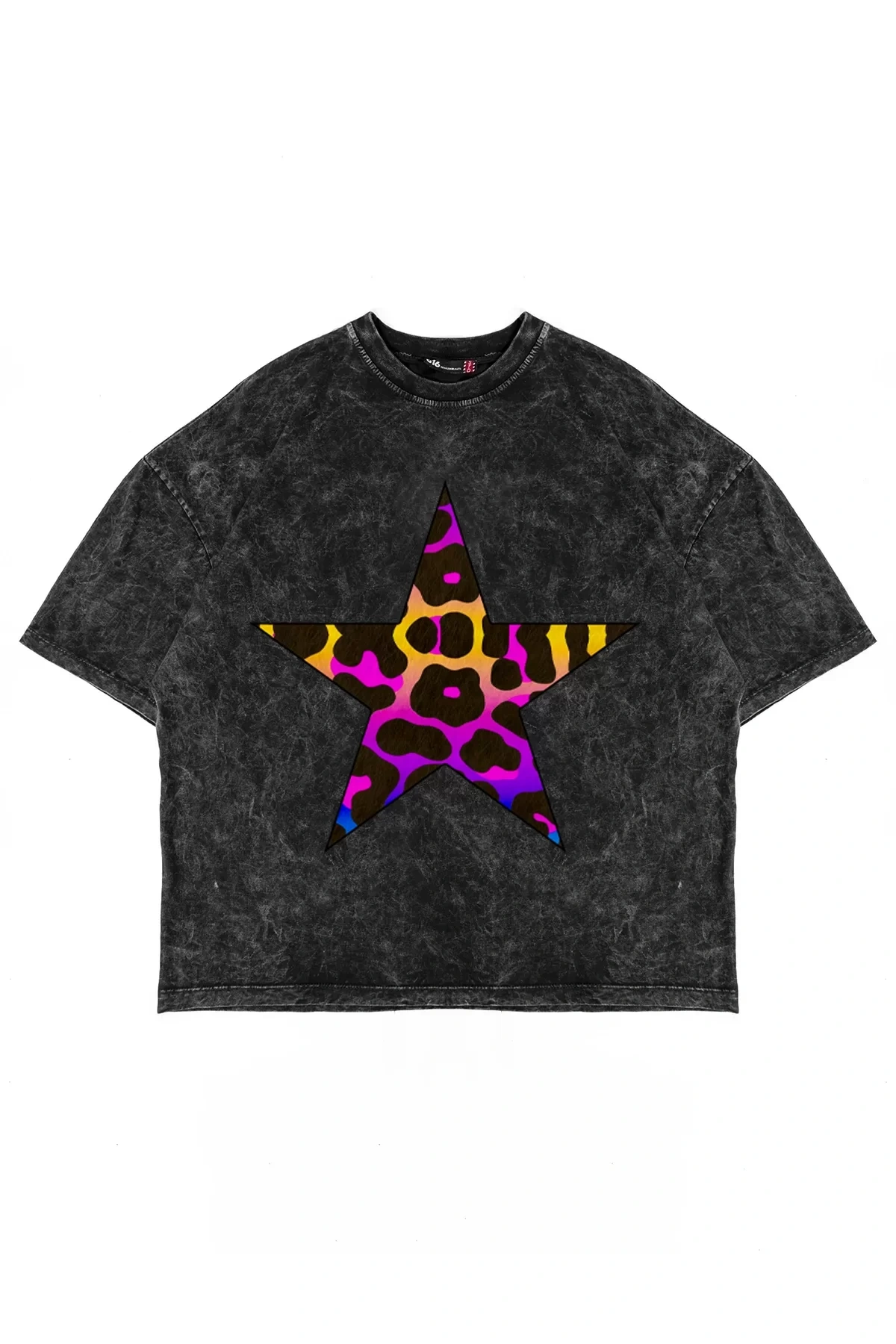 Karma Leopar Baskılı Oversize Unisex Premium Yıkamalı Siyah Tshirt