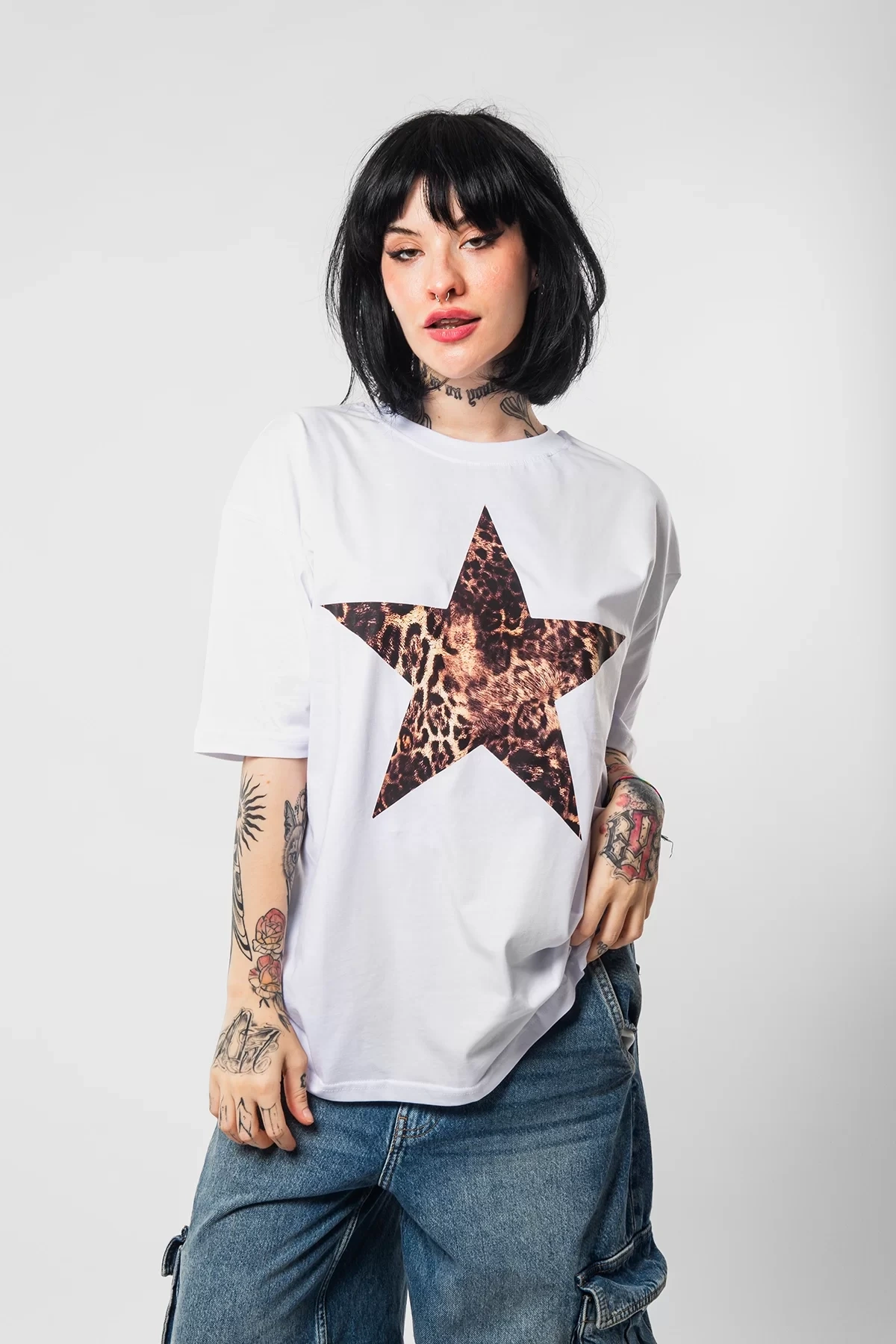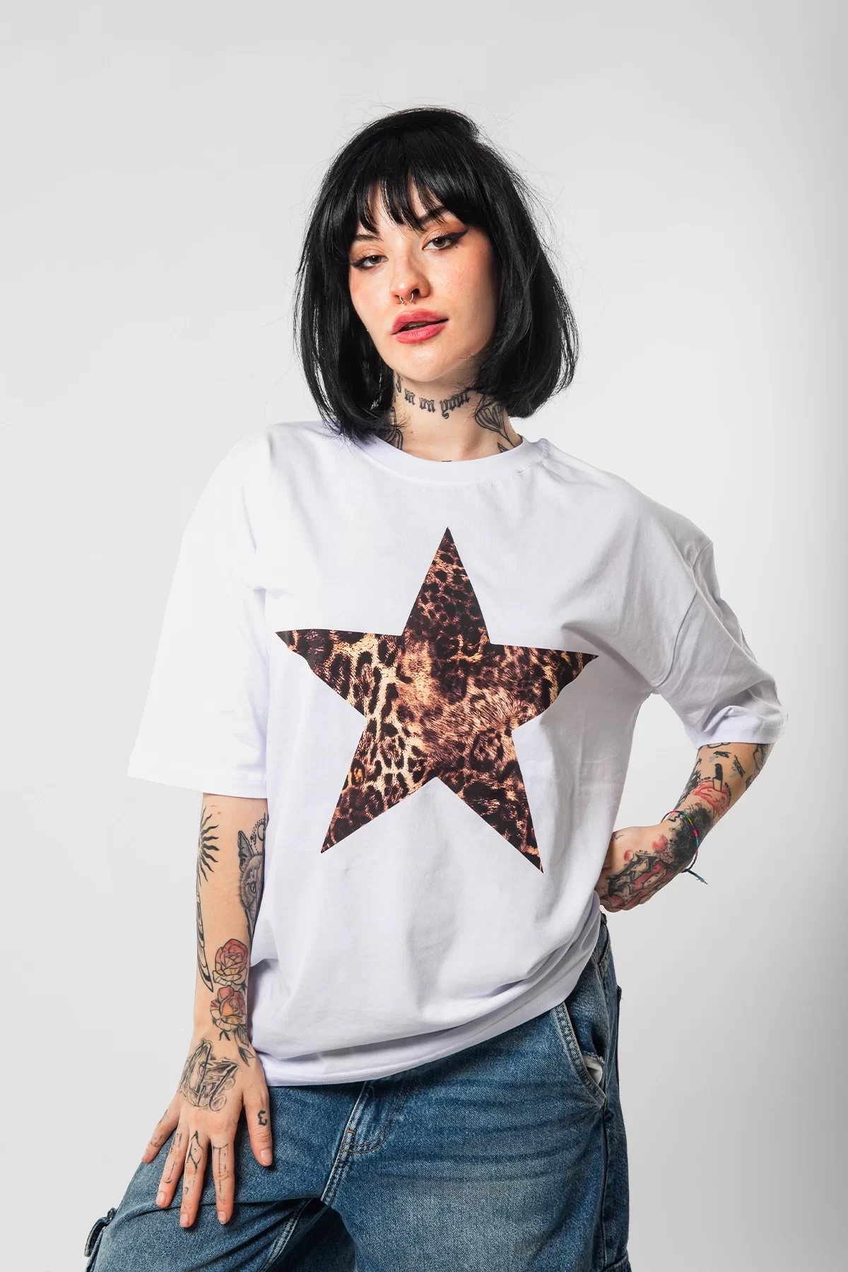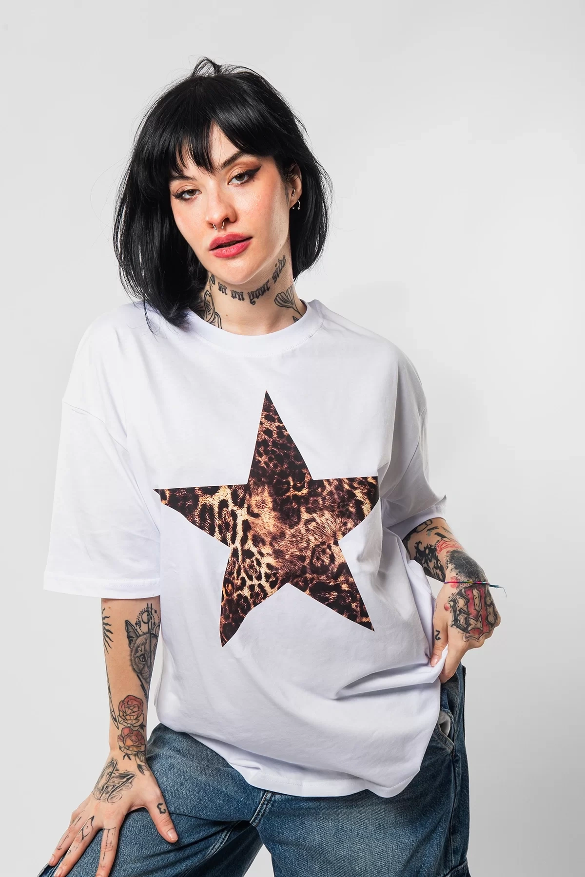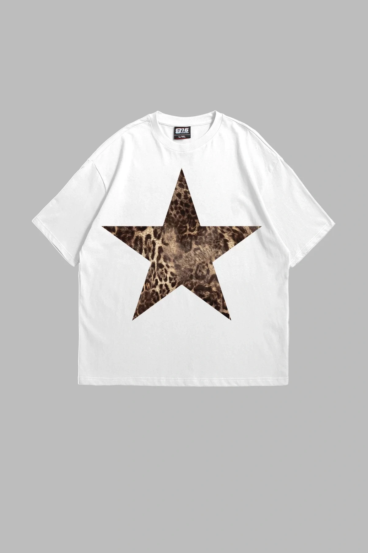Starz Leopar Baskılı 24/1 Oversize Unisex Beyaz Tshirt