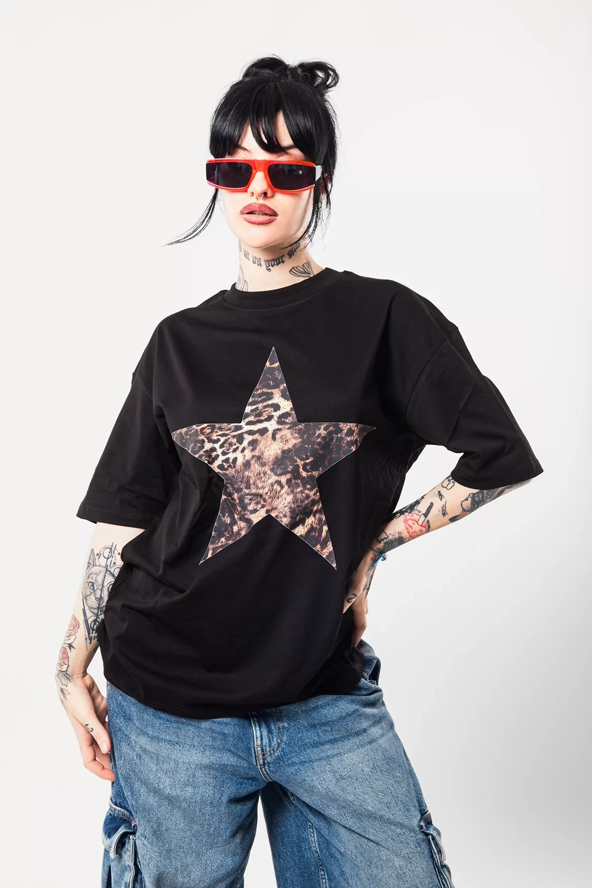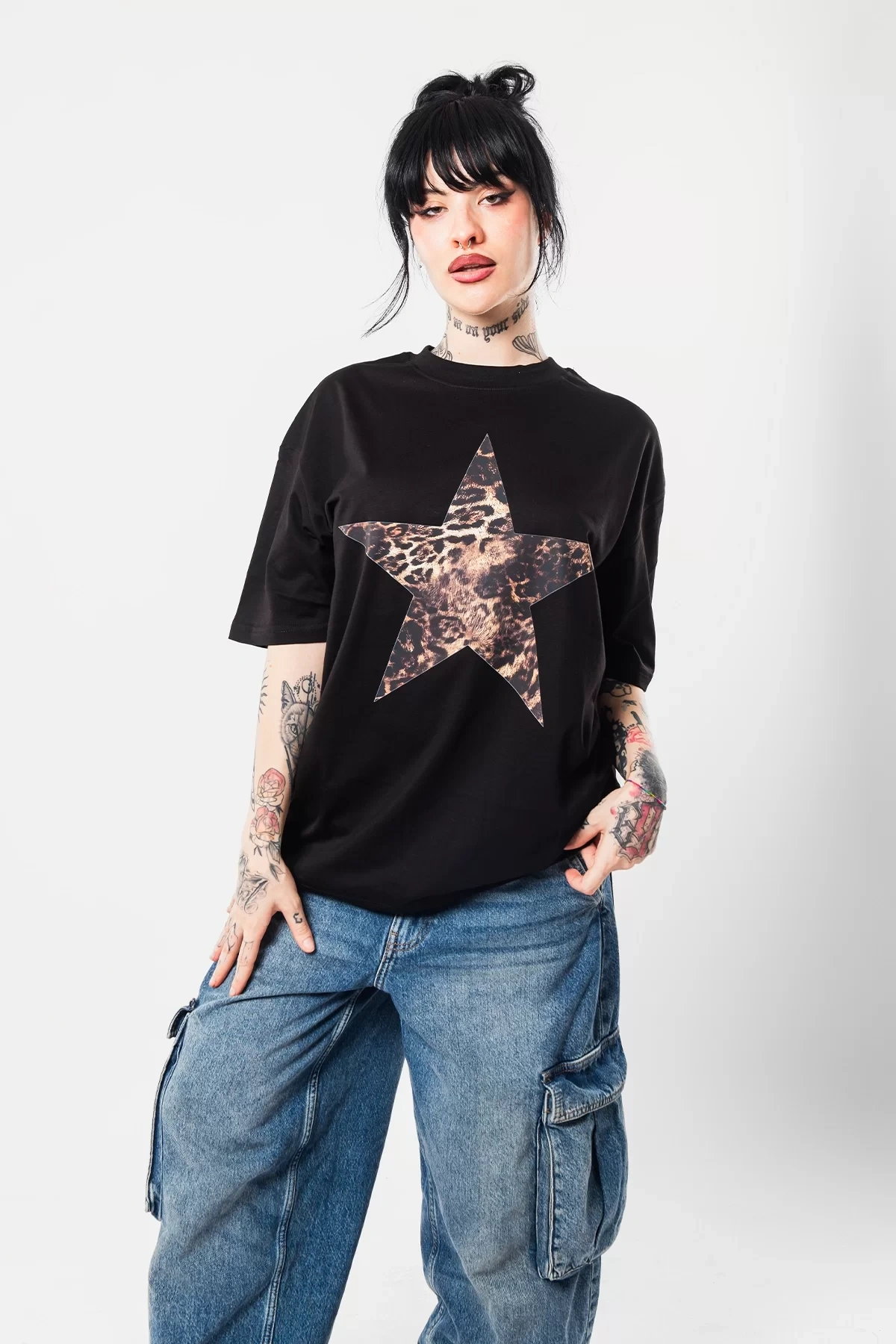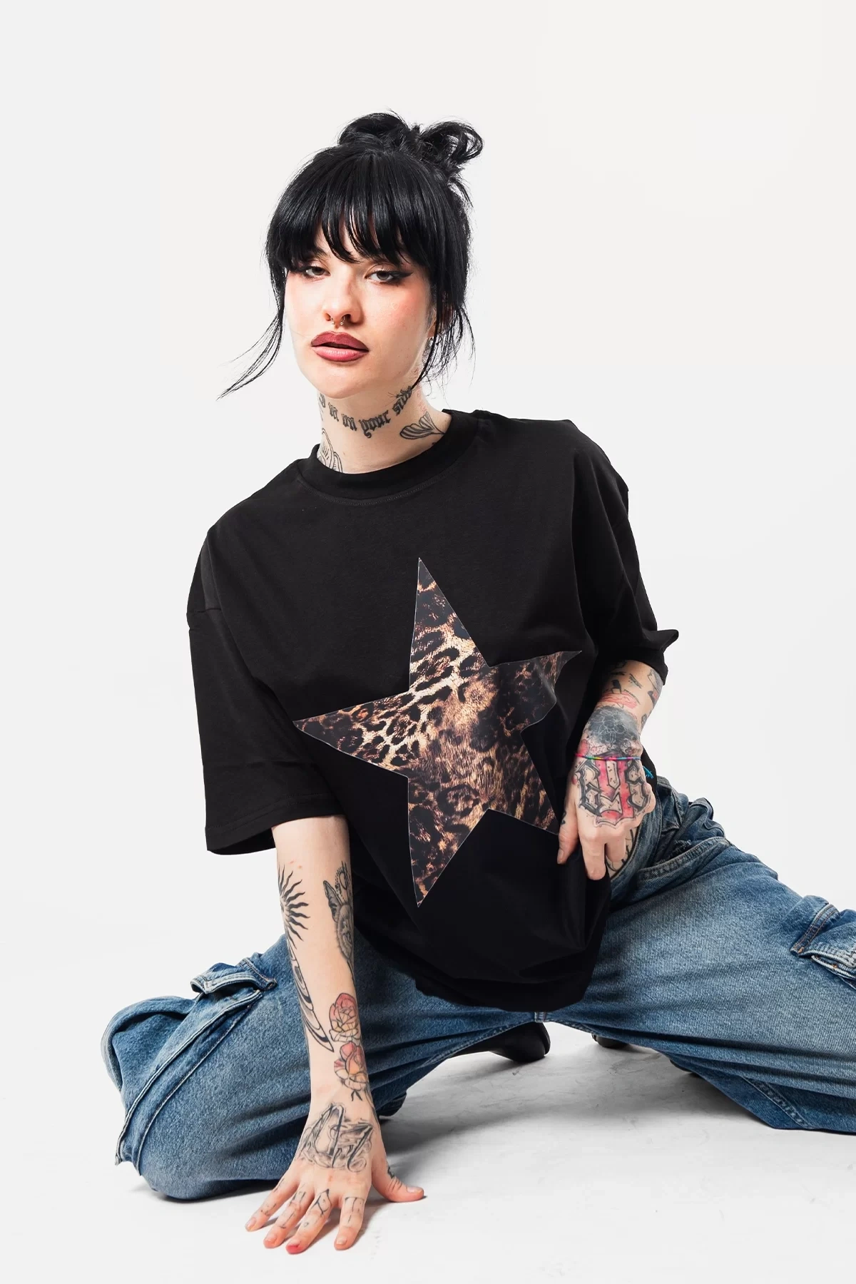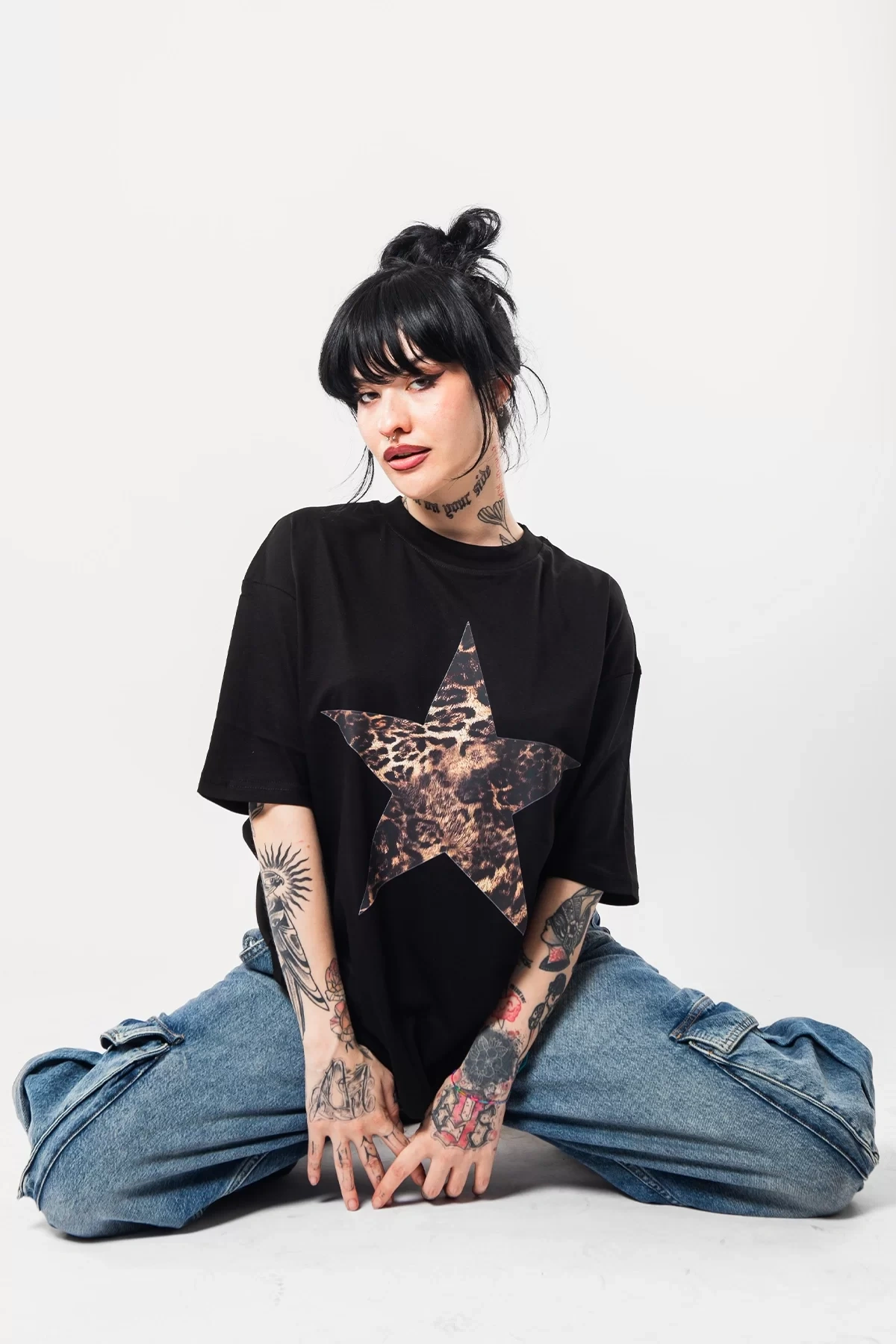 Starz Leopar Baskılı 24/1 Oversize Unisex Siyah Tshirt
