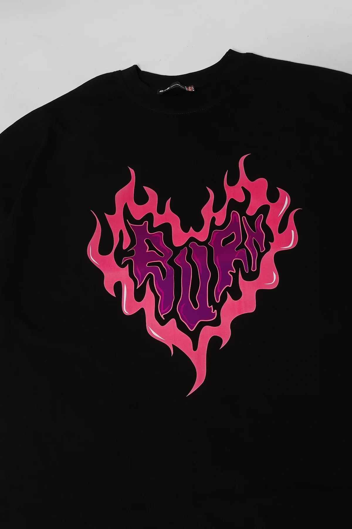 Burn Heart Baskılı Siyah Unisex Oversize Tshirt