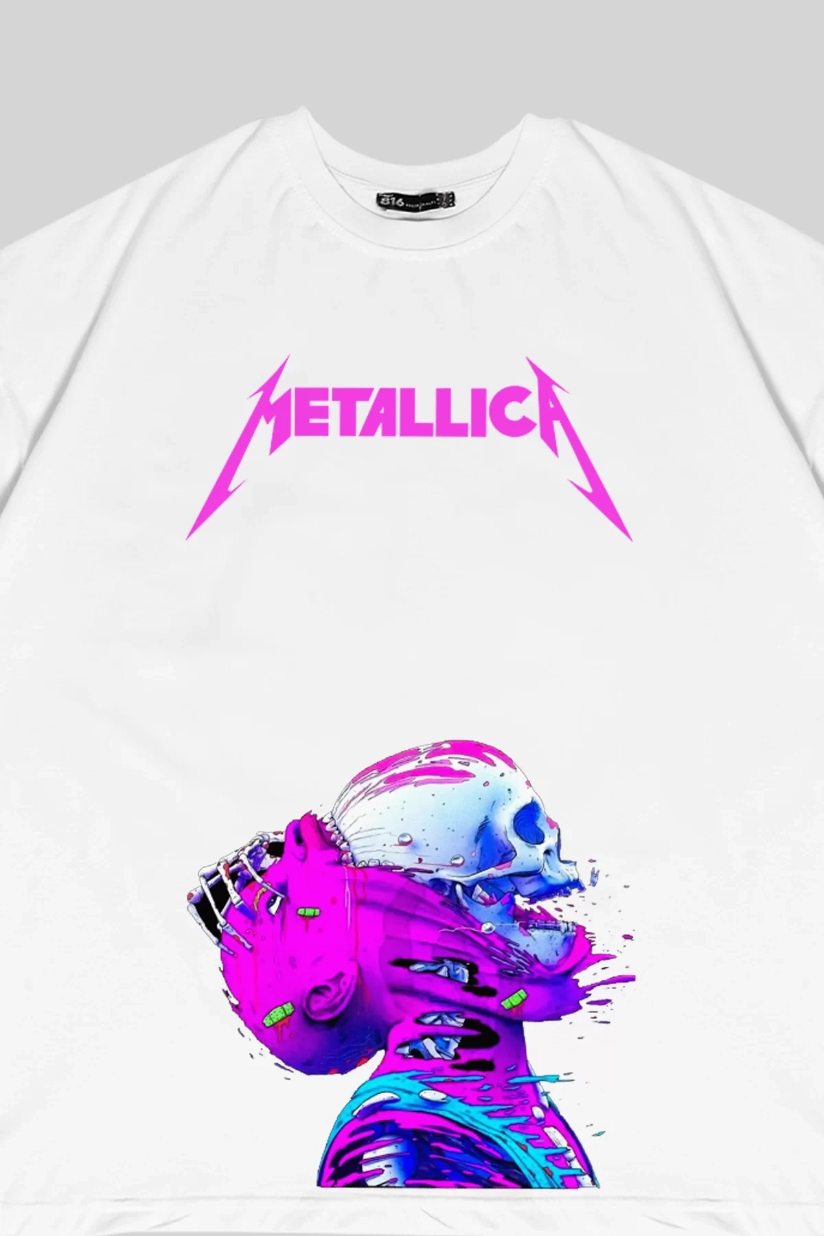 Metallica Neon Pembe Baskılı Beyaz Unisex Oversize Tshirt