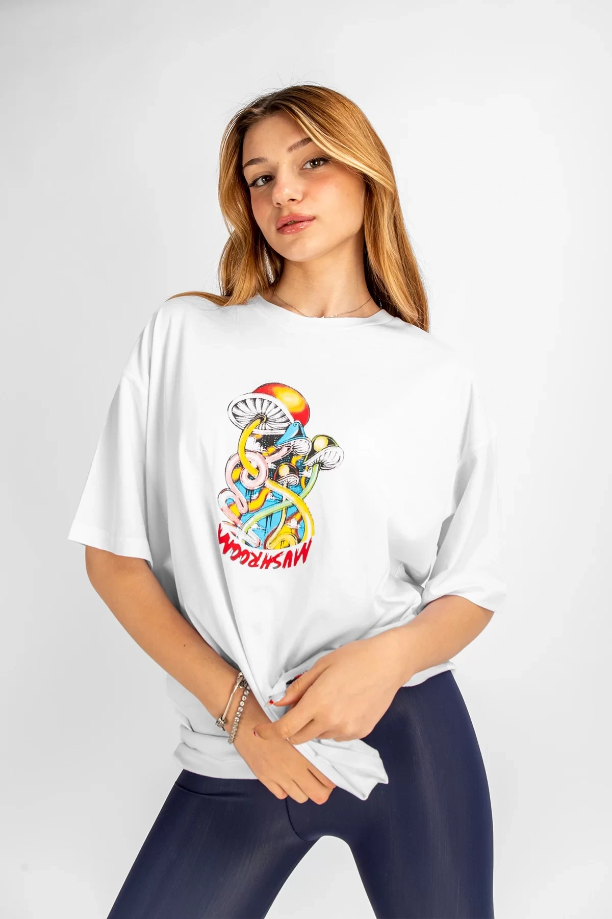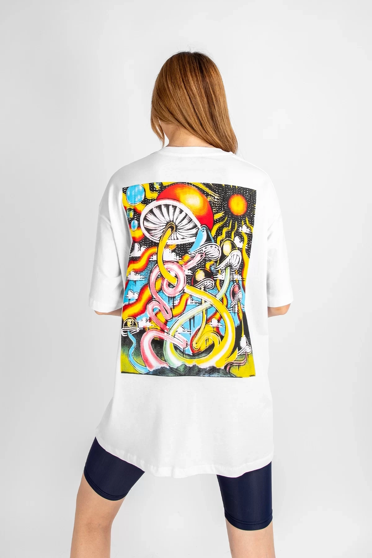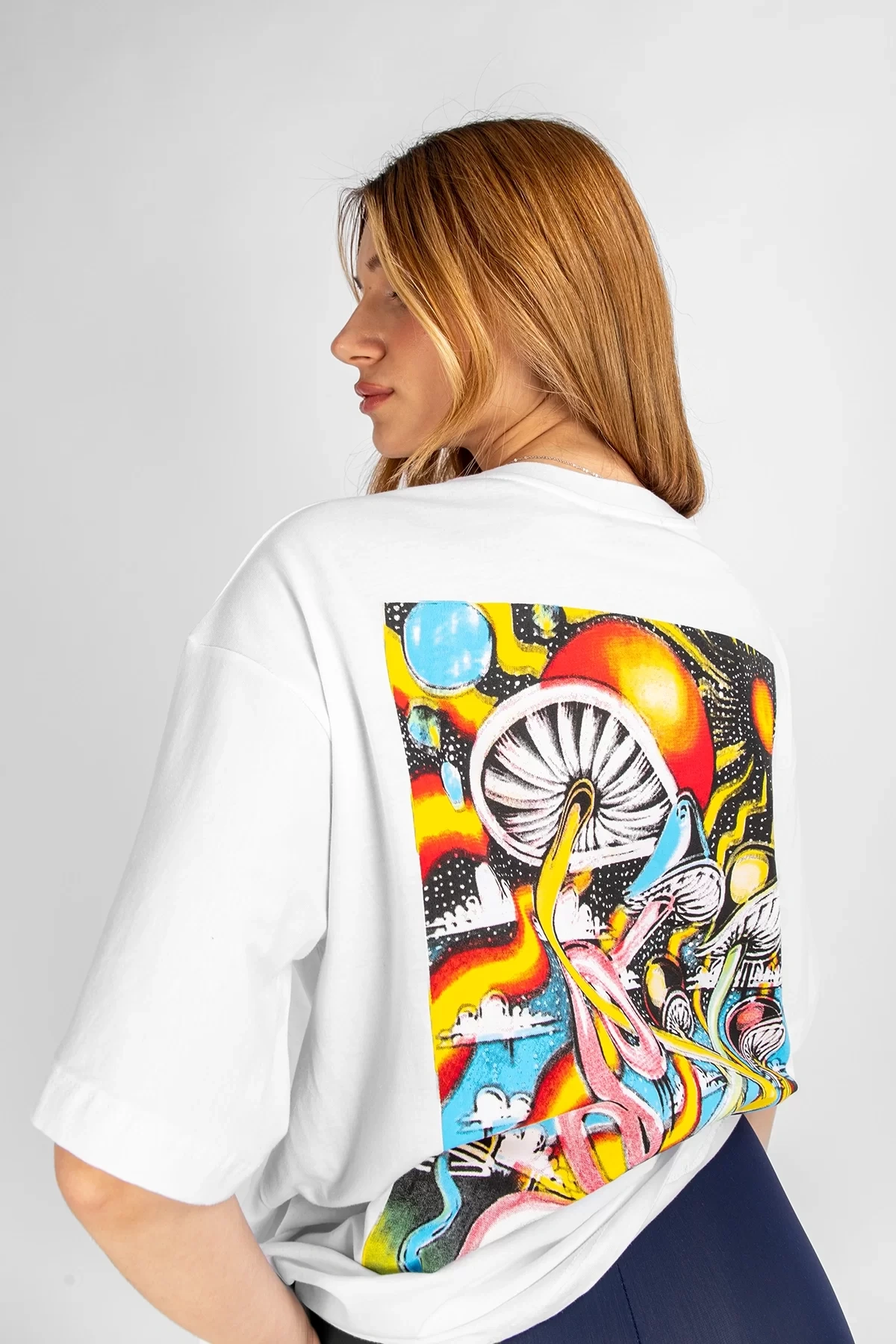 Trippy Mushrooms Sırt Baskılı Beyaz Unisex Oversize Tshirt