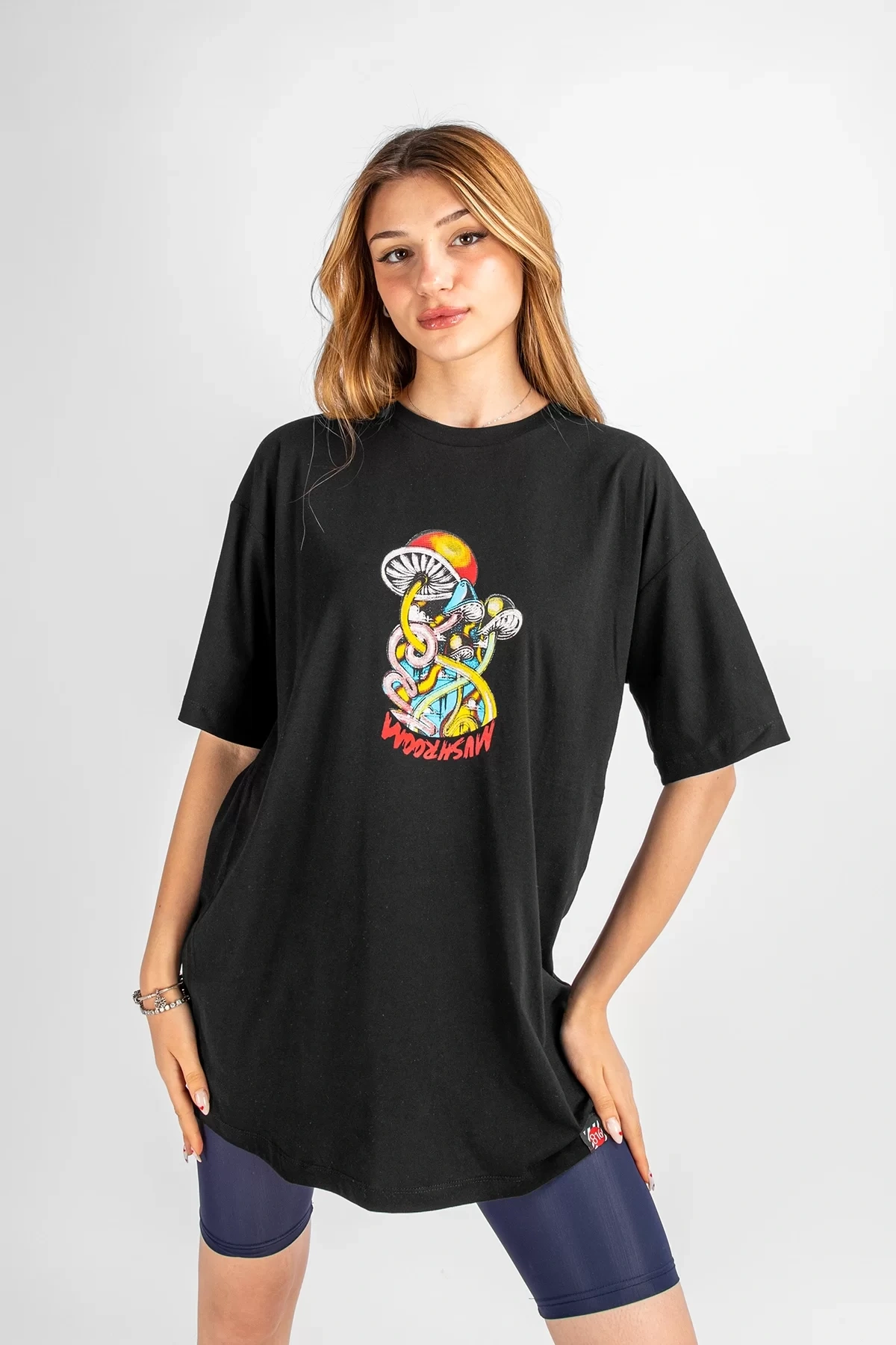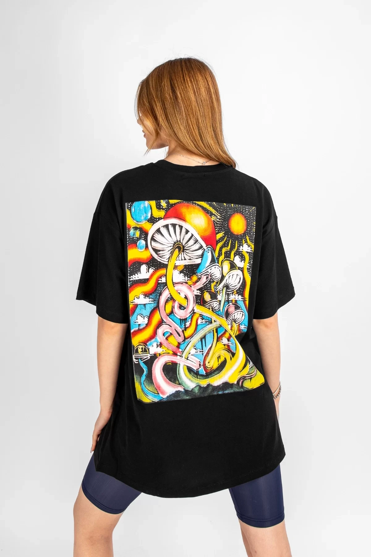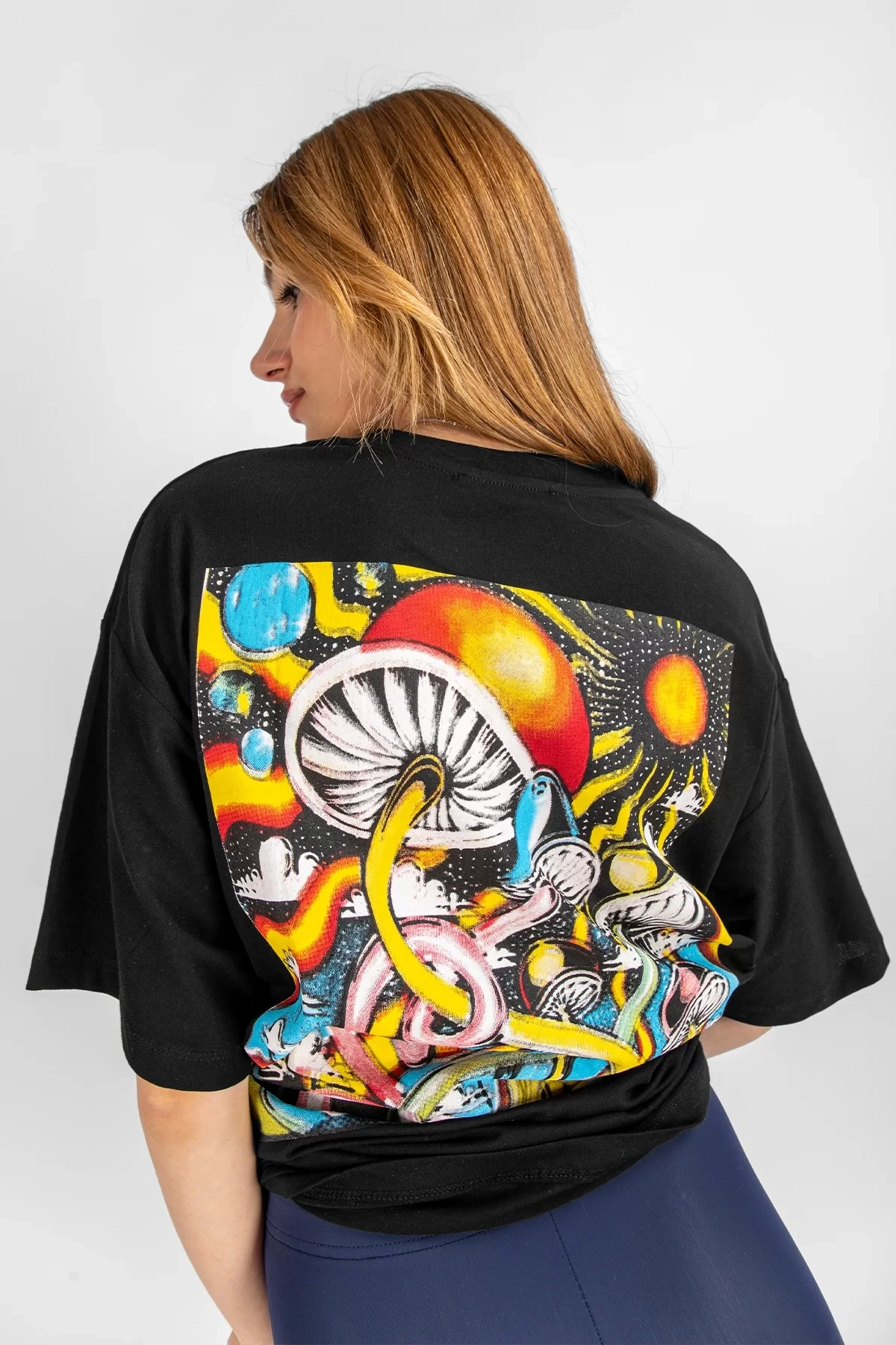 Trippy Mushrooms Sırt Baskılı Siyah Unisex Oversize Tshirt