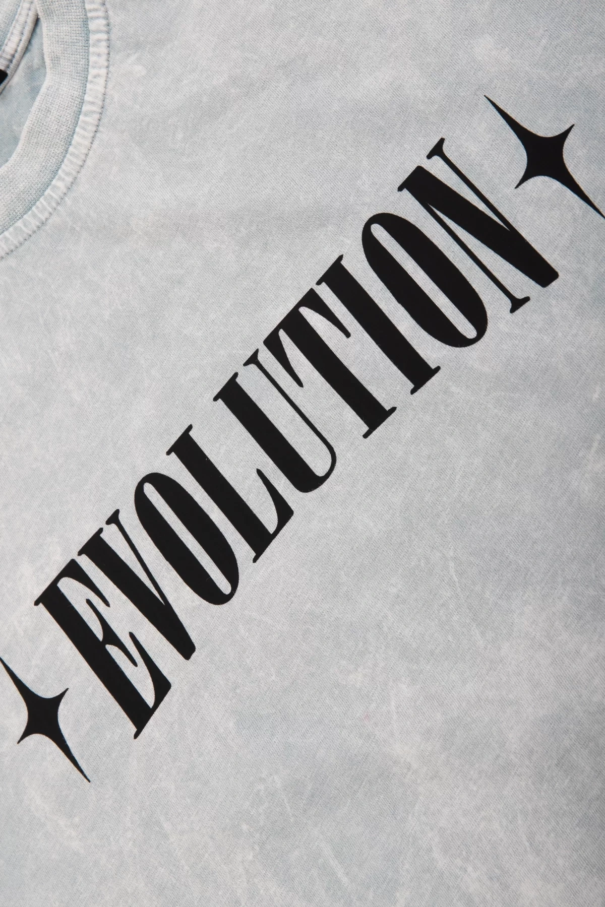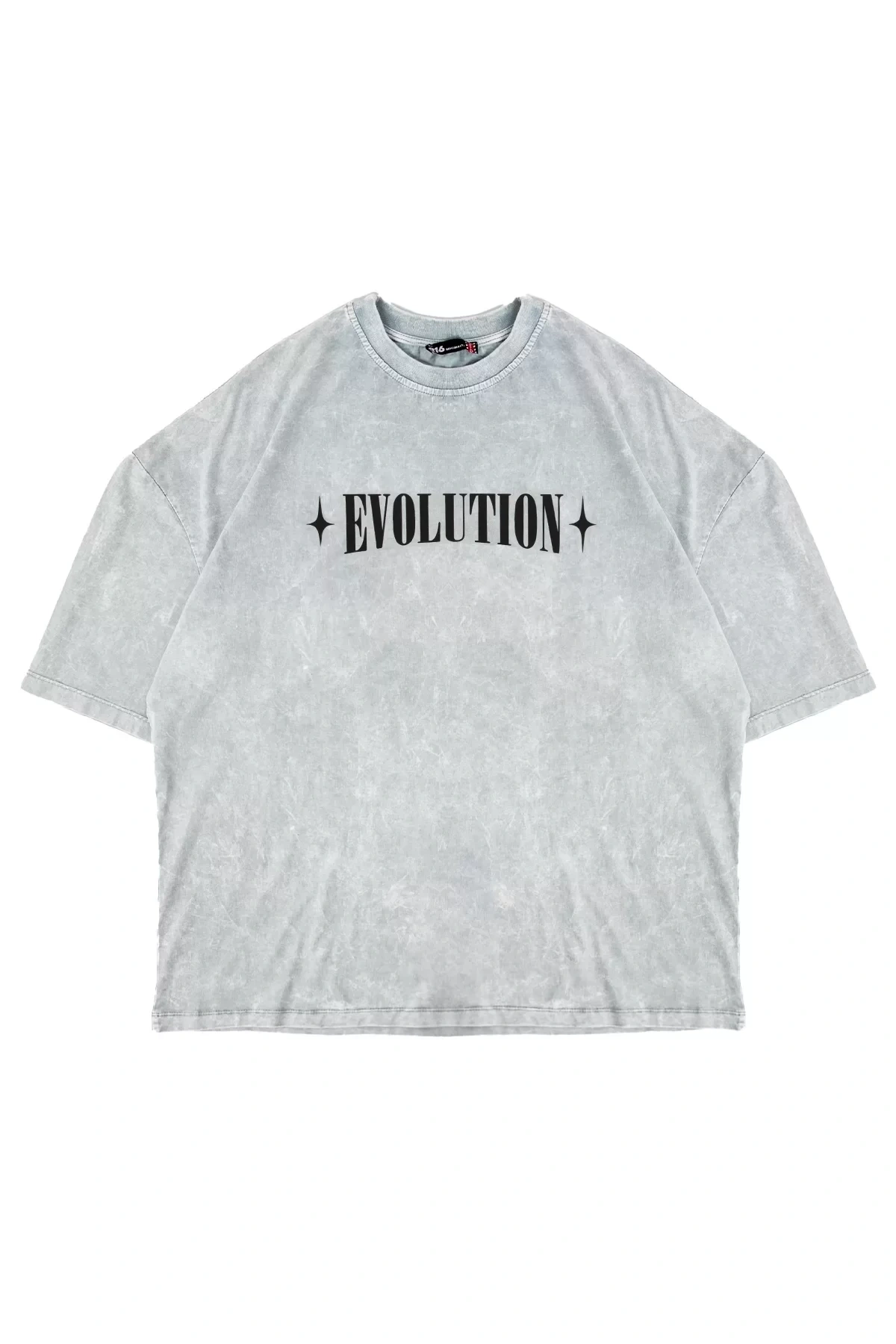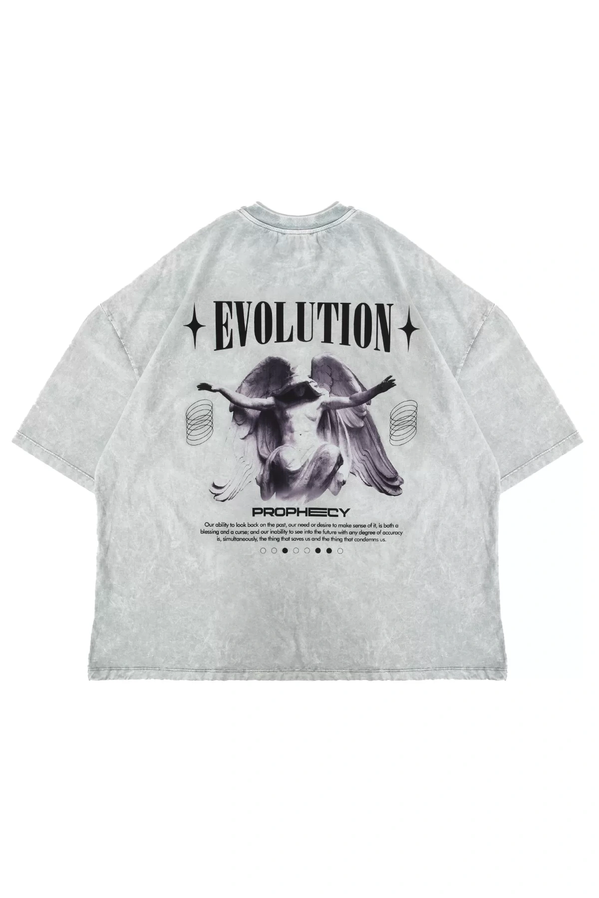Yıkamalı Beyaz Evolution Sırt Baskılı Oversize Unisex Kapüşonlu Tshirt