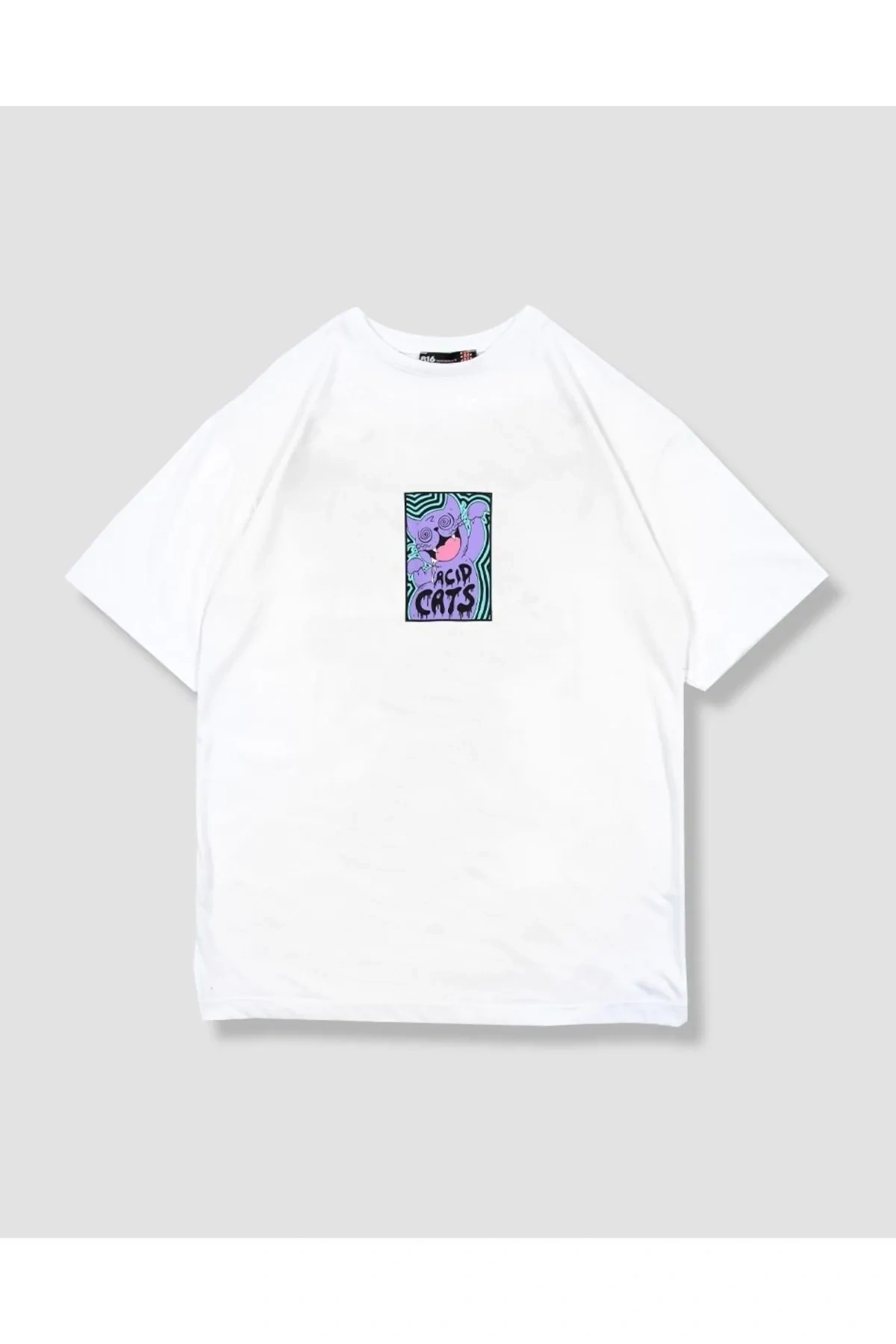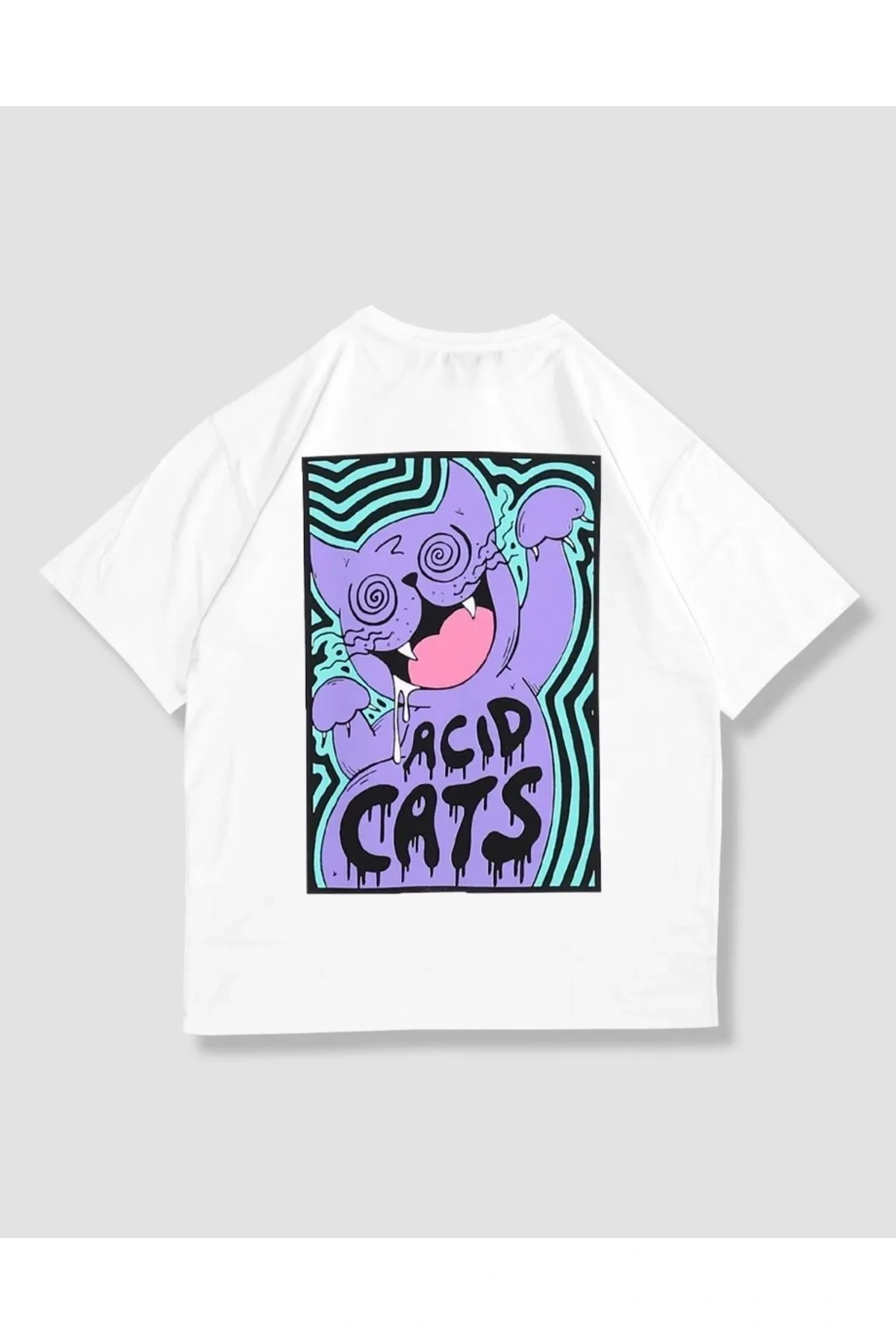 Acid Cat Sırt Baskılı Unisex Beyaz Tshirt