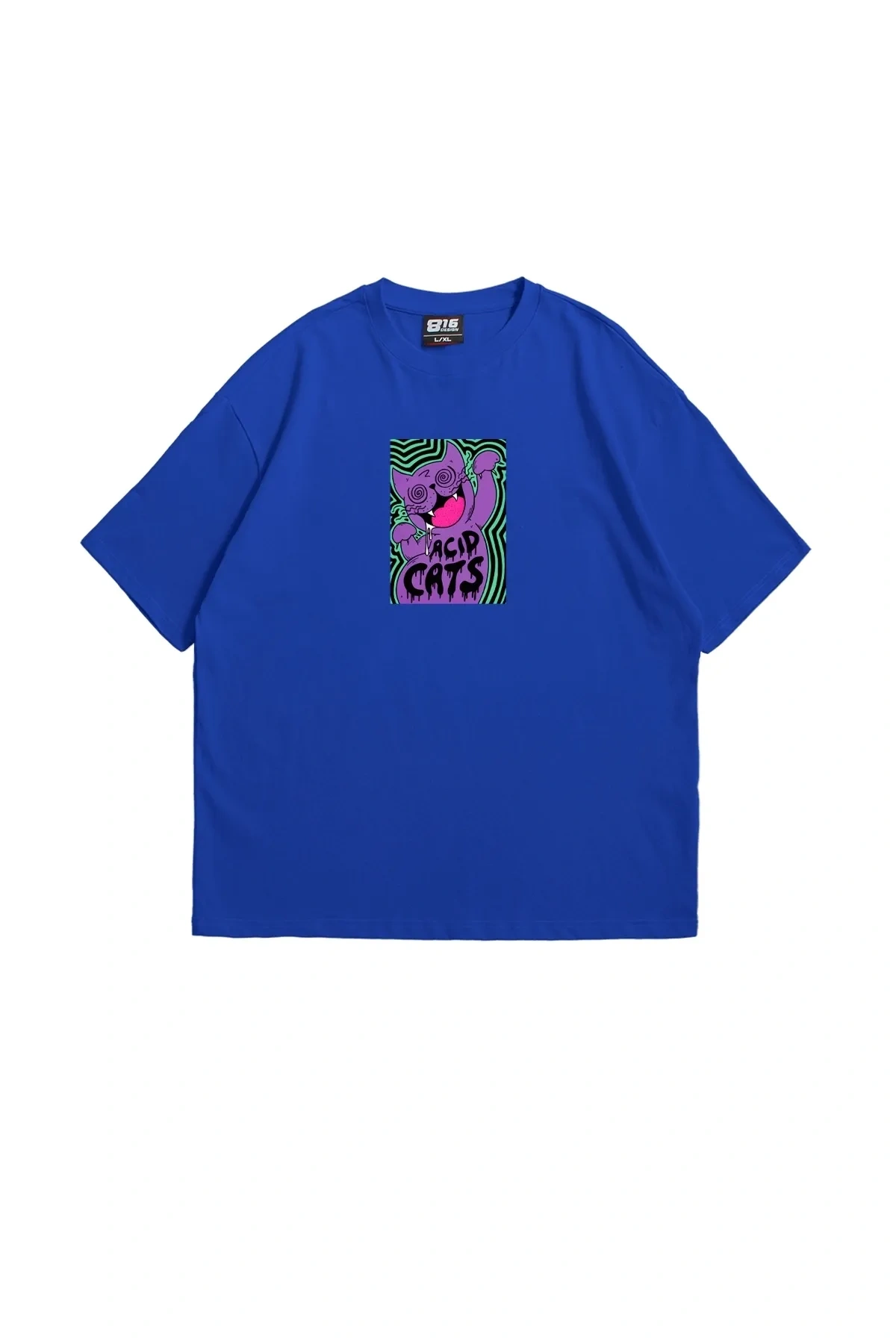 Acid Cat Sırt Baskılı Unisex Mavi Tshirt