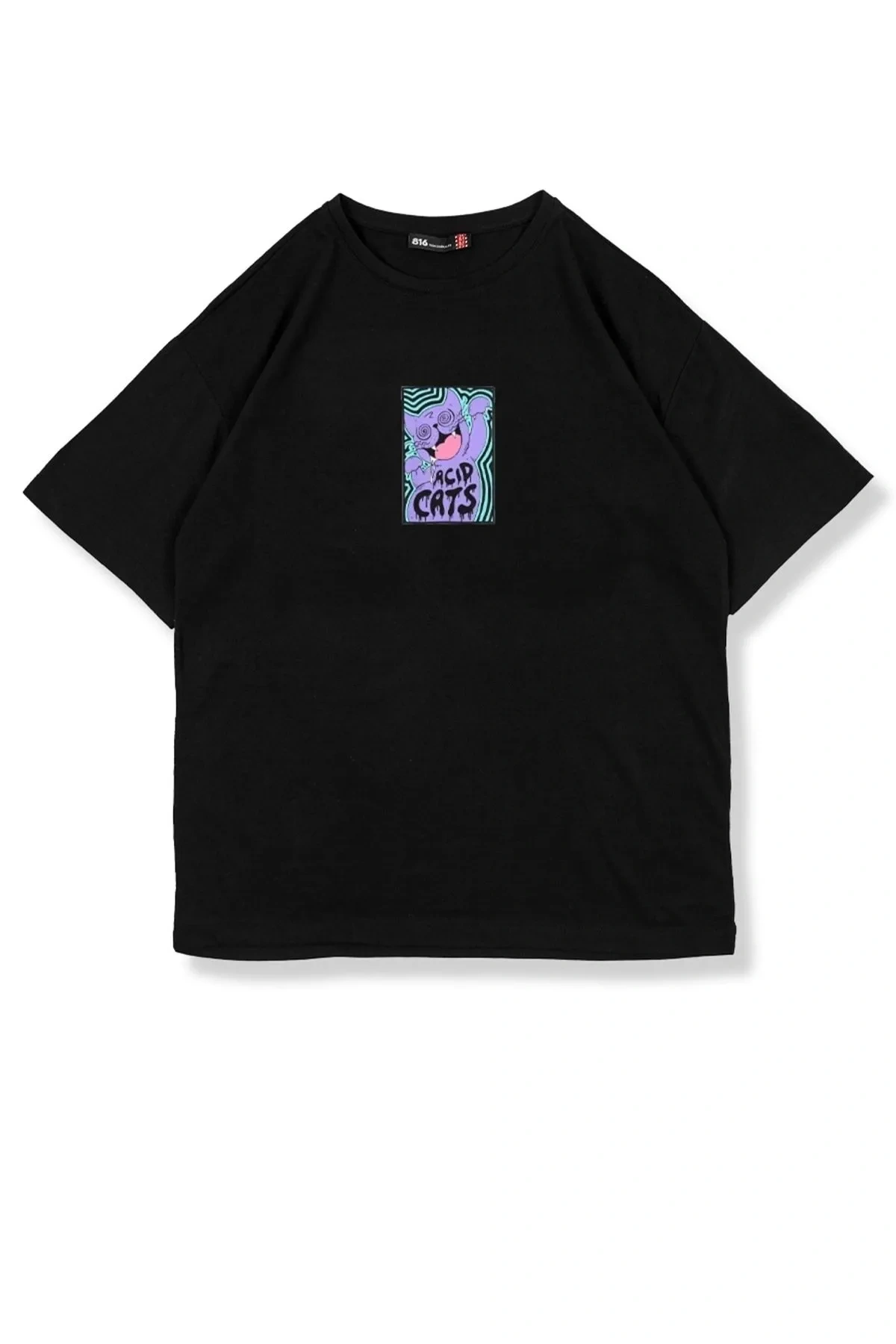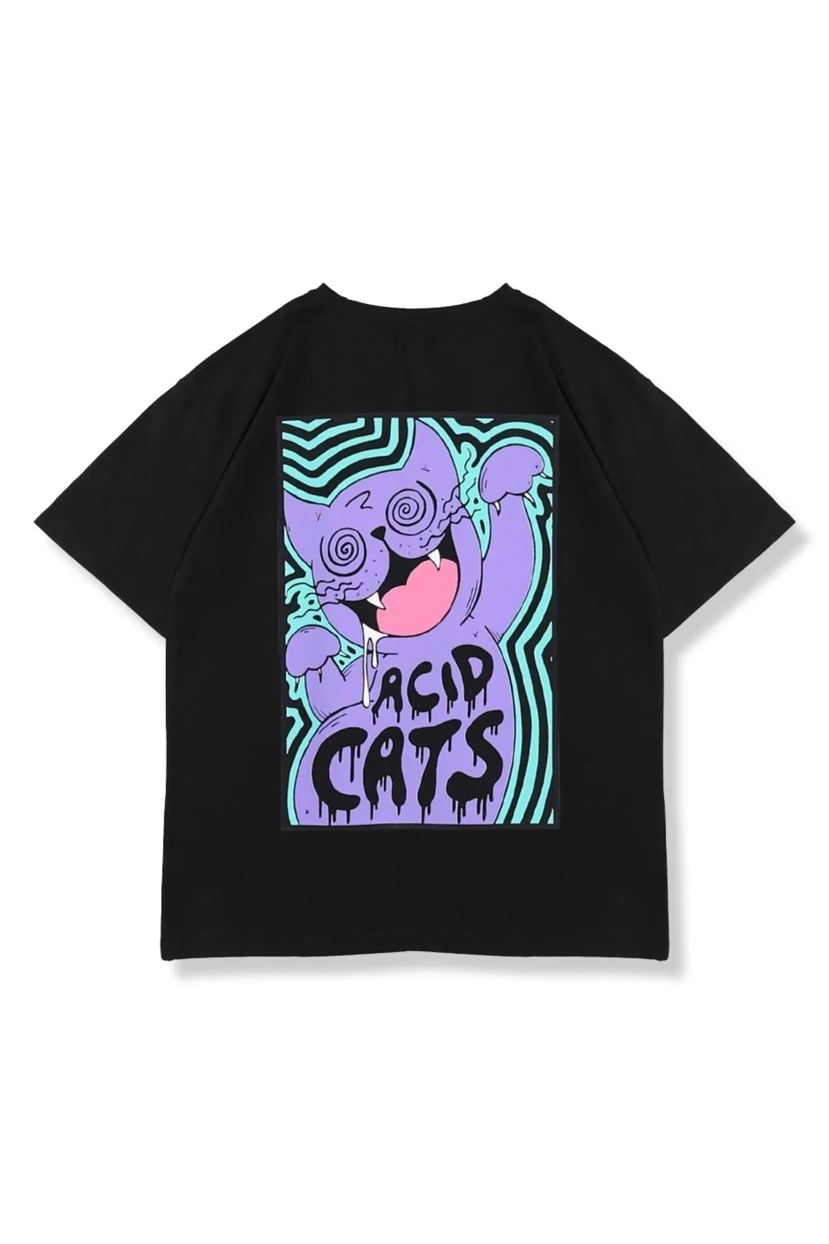 Acid Cat Sırt Baskılı Unisex Siyah Tshirt