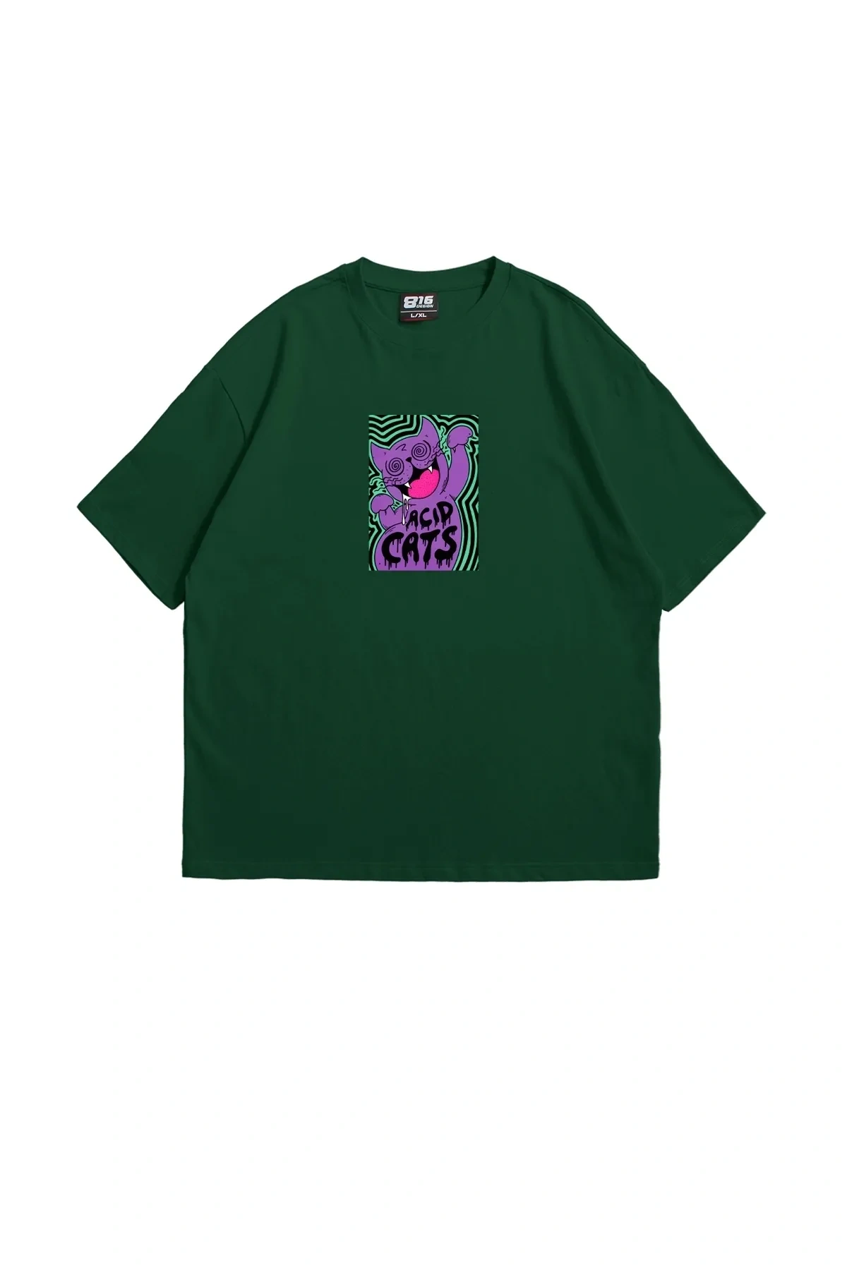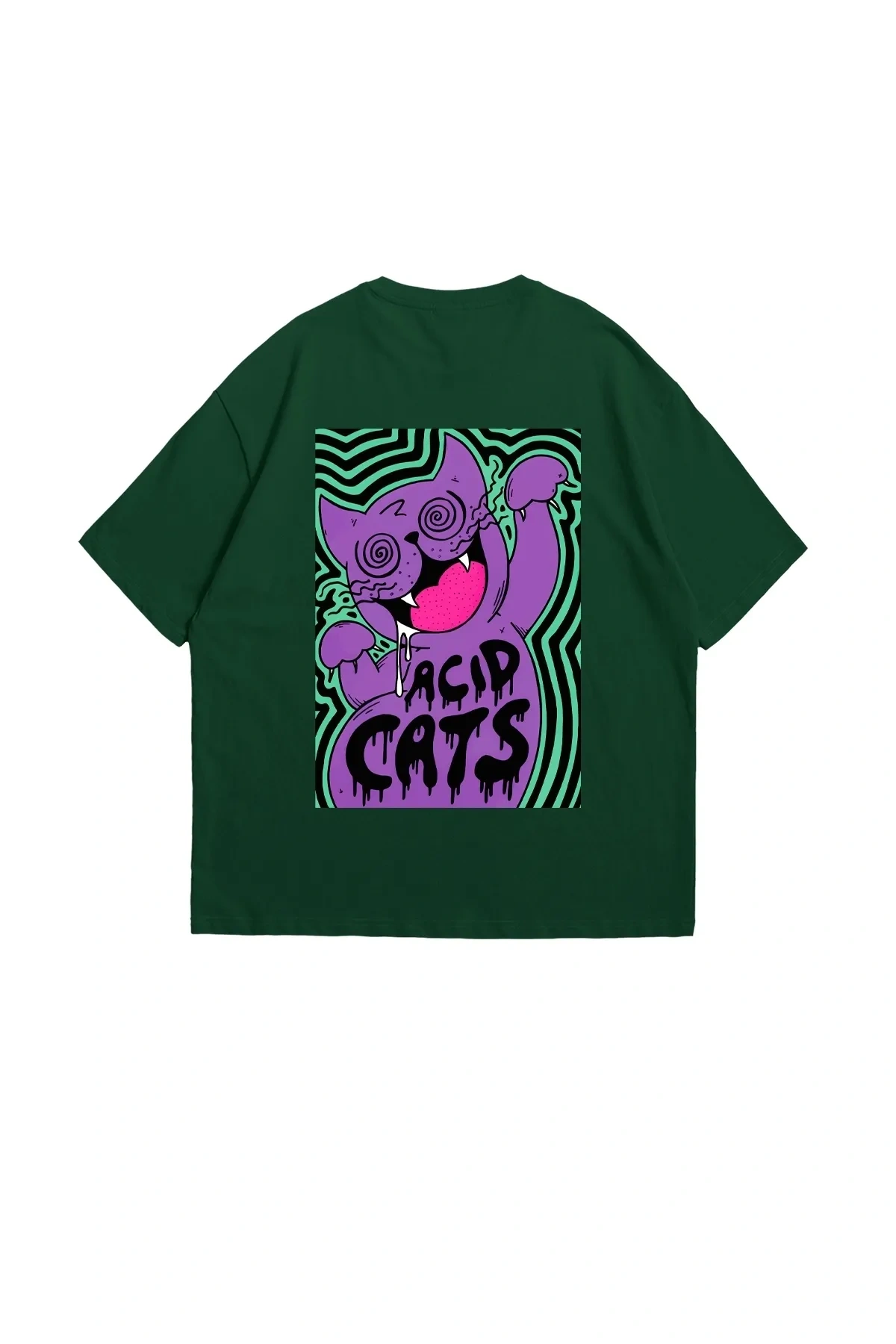 Acid Cat Sırt Baskılı Unisex Yeşil Tshirt