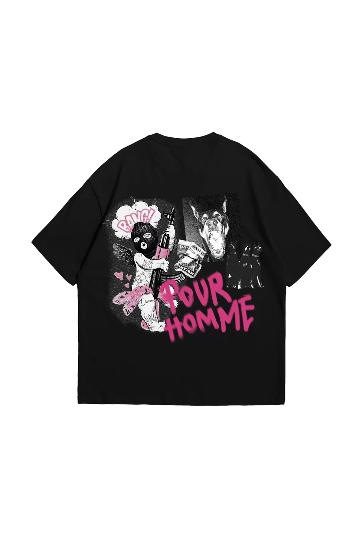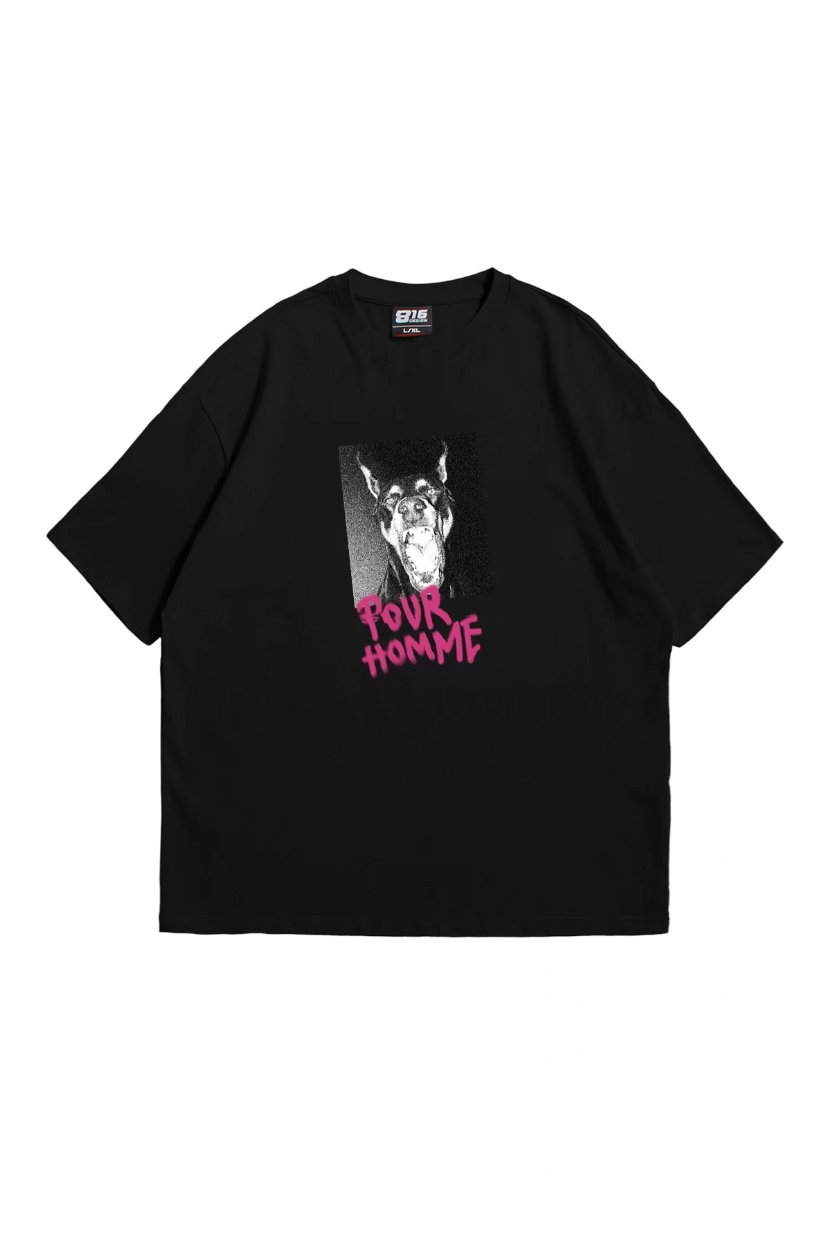 Pour Homme 24/1 Baskılı Oversize Unisex Siyah Tshirt