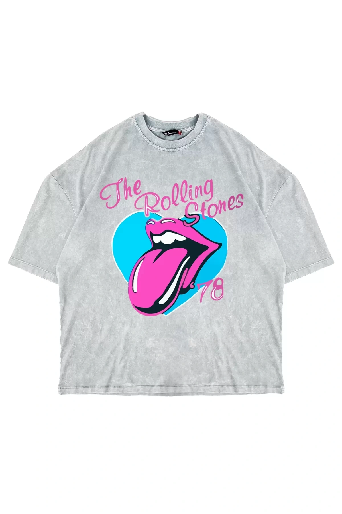 Rolling Stones Baskılı 24/1 Baskılı Oversize Unisex Yıkamalı Siyah Tshirt