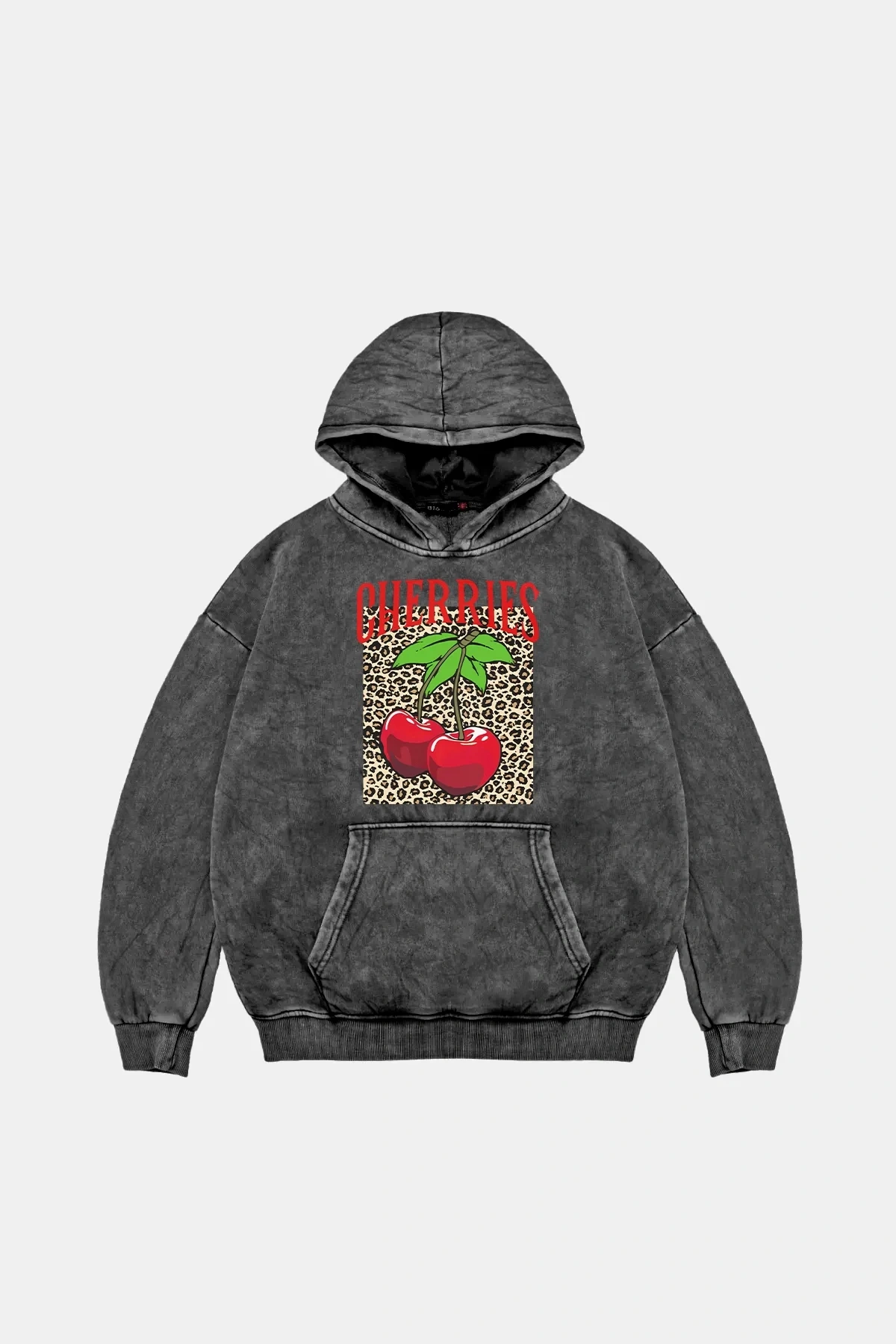Cherries Leopard Oversize Unisex Yıkamalı Siyah Hoodie