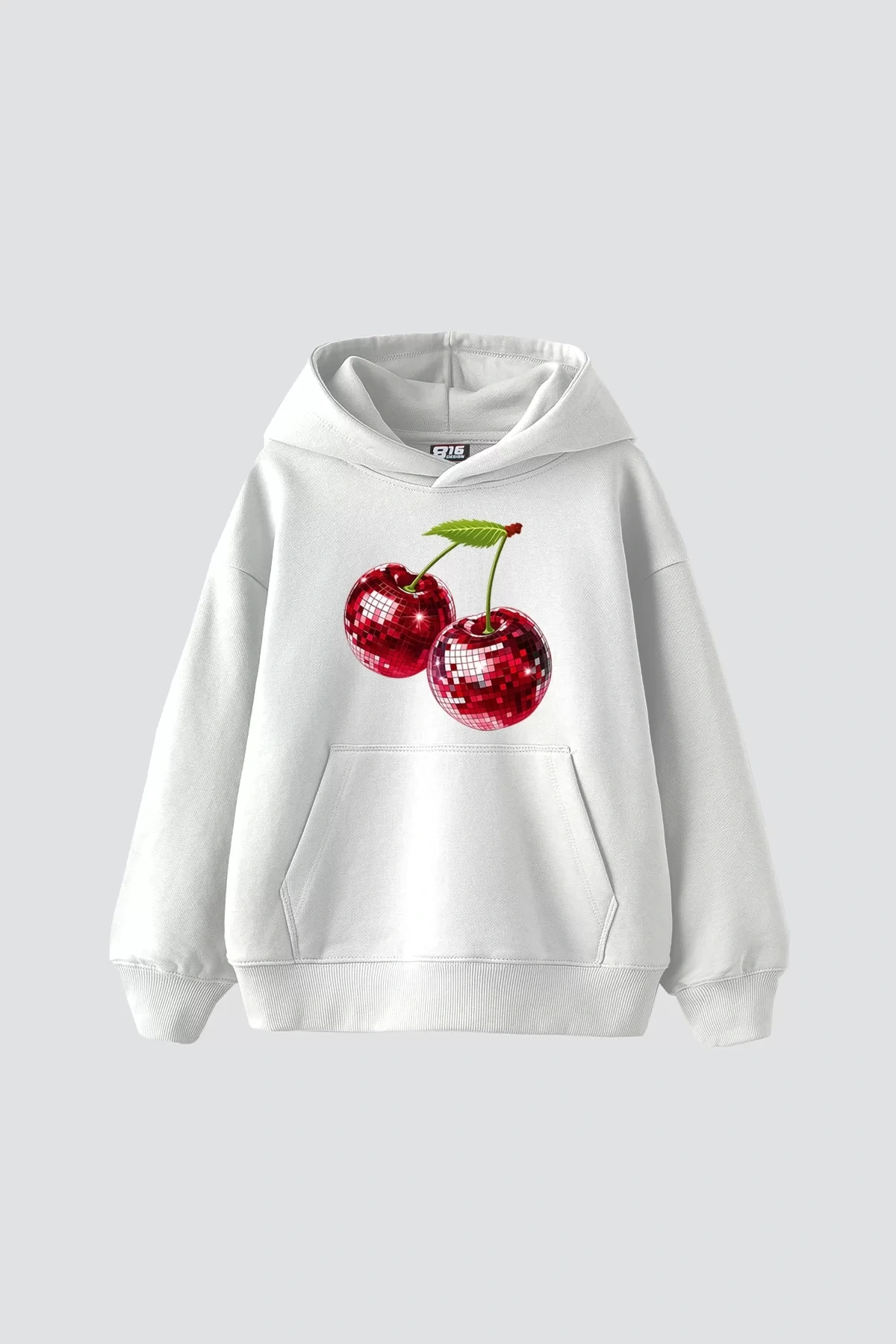 Disco Cherry Baskılı Oversize Unisex Beyaz Hoodie