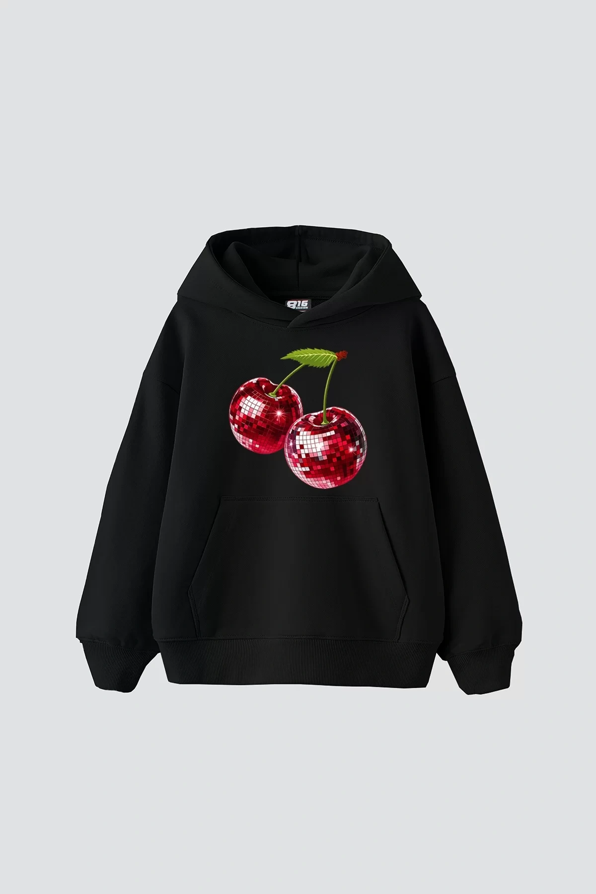 Disco Cherry Baskılı Oversize Unisex Siyah Hoodie